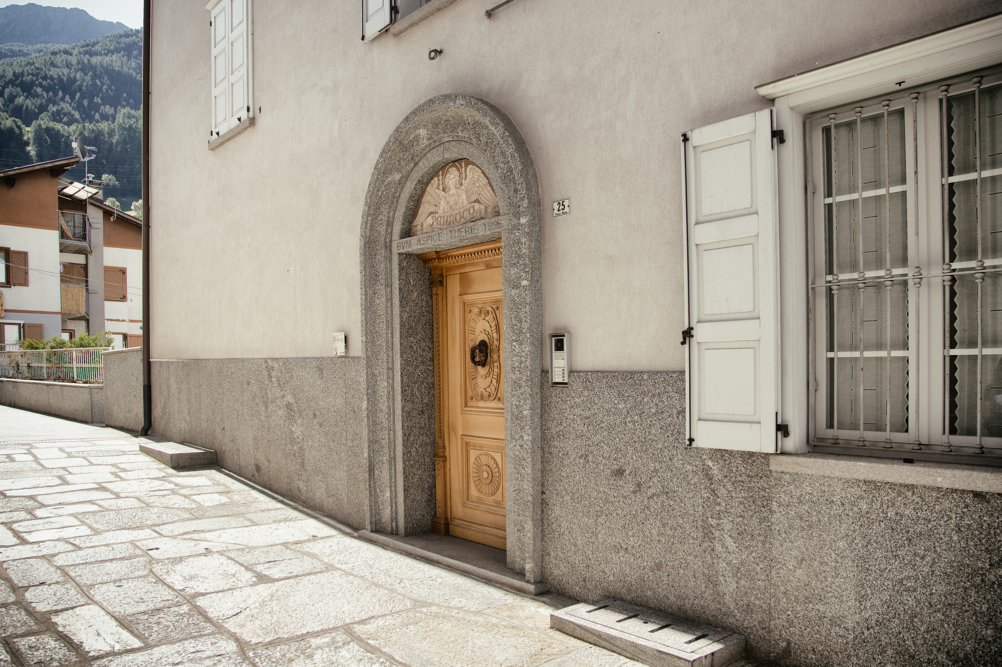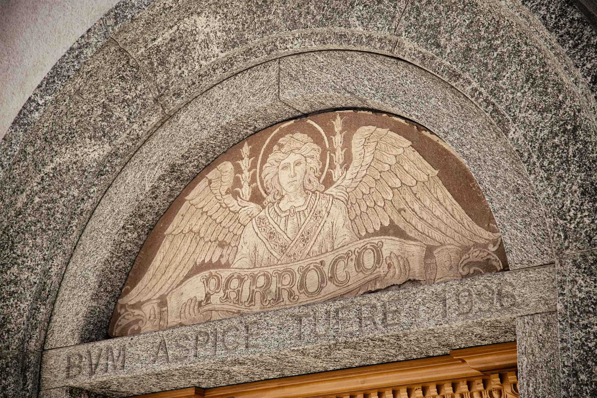 Realizzato da Erminio Dioli tra il 1945 e il 1947, l’Angelo della casa parrocchiale è dipinto nella lunetta sopra l’ingresso dell’edificio, dove assume il ruolo simbolico di custode spirituale. L’immagine è impostata in modo rigorosamente simmetrico, adattandosi alla superficie curva e compressa della lunetta, e richiama le figure ieratiche dell’arte medievale e del primo Rinascimento italiano.
