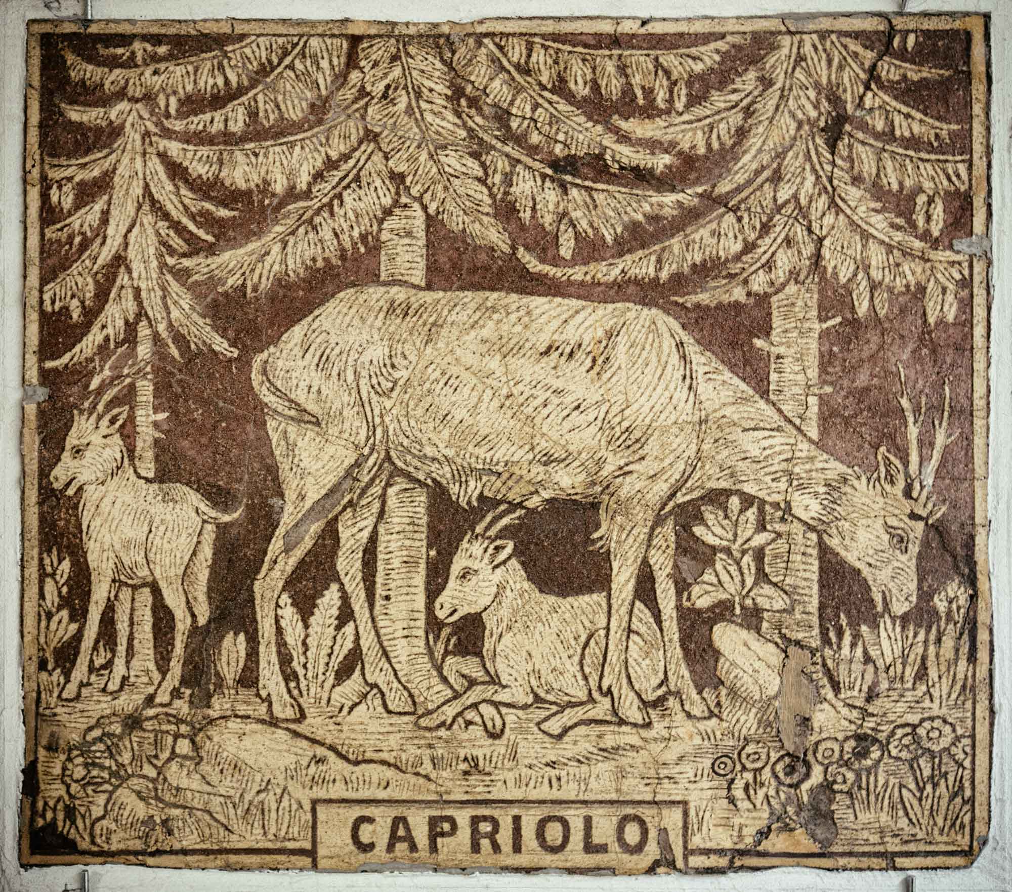 Realizzati da Erminio Dioli nel 1945 e successivamente strappati nel 2004 dalla fascia del sottotetto di Villa Rota Candiani, questi graffiti decorativi rappresentano un autentico omaggio all’ambiente alpino e alla sua simbologia. I pannelli illustrano con precisione naturalistica specie faunistiche e floreali tipiche della Valmalenco: il capriolo, la pernice, l’abete rosso, il pino silvestre, la stella alpina, la margherita e il bucaneve diventano emblemi del legame tra natura e architettura.