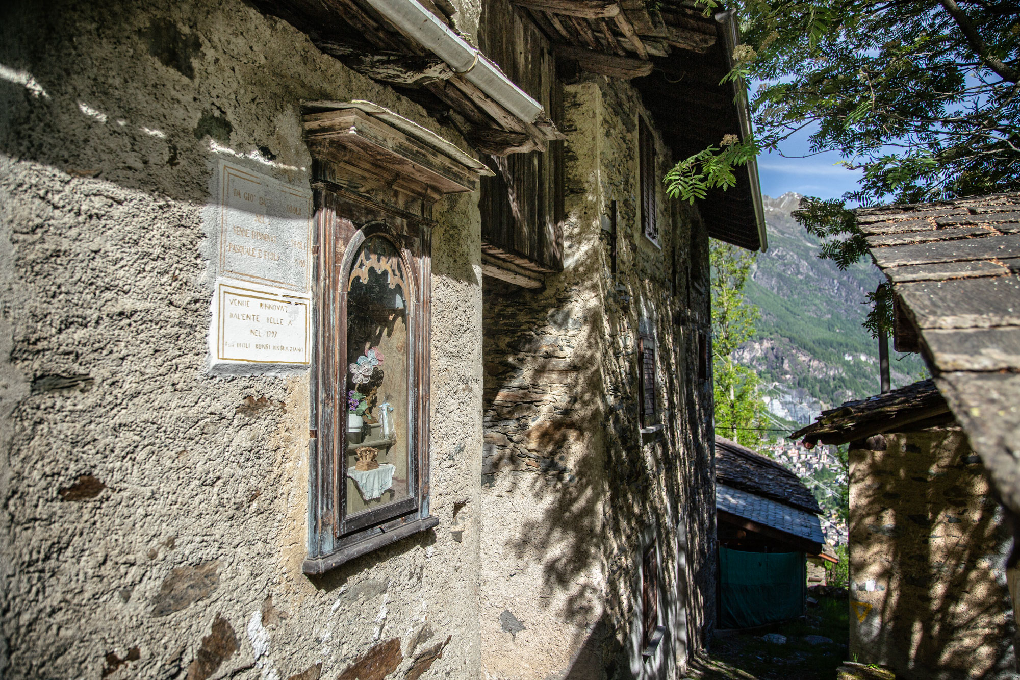 Percorso per il culto // La strada “cavalèra” costituisce anche, per un tratto, un percorso attrezzato per il culto; parte dall’edicola posta in Contrada Negrini (capitèl di Negrìn), passa per l’edicola intitolata alla Beata Vergine della Cintura in Contrada Bricalli (capitèl di Brich) per raggiungere, in località Curada Bassa, due nicchie consecutive e un semplice crocifisso ligneo appeso sul fronte di un fabbricato. La prima nicchia, con cornice di legno intagliato, contiene una statua della Madonna e di fianco era riportata la scritta, ora illeggibile, “Da Giò Battista Dioli nel 1766”. Rinnovata da Dioli Pasquale e figli nel 1910. La seconda, rispondente alla stessa tipologia, reca una scritta deteriorata: “Da Giò Battista Dioli nel 1737”. Rinnovata da Dioli Pasquale e figli nel 1910. Rinnovata dall’Ente Belle Arti nel 1997”. Proseguendo il percorso, passata la Crùus de la cüràda, una croce votiva in legno, è visibile sul fronte di un fabbricato una bella edicola incorniciata con un affresco raffigurante la Beata Vergine con i Santi Rocco e Sebastiano (Patroni di Caspoggio), dipinta nel 1841 da un autore ignoto e con la scritta “ANDREA DE ANDREINI F.F. L’ANNO 1841”.