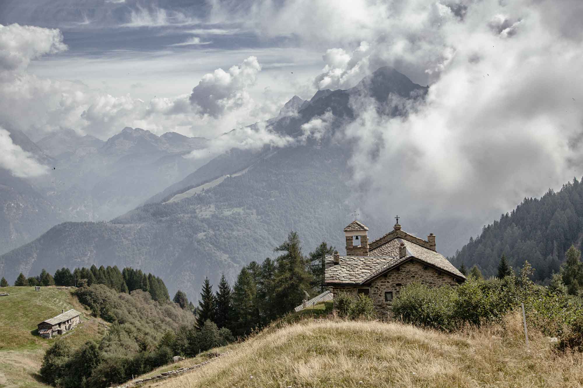 La chiesa // La chiesa di Piasci, in dialetto conosciuta come la ğeśa di ciàasc, sorge a sud-est del maggengo e ha annessa l’abitazione del parroco. È stata voluta dagli alpigiani per porre fine alle stragi della Seconda guerra mondiale. Fu inaugurata il 19 settembre 1943 ed è dedicata alla Madonna, Maria Regina della Pace. La calce venne ricavata dalla fornace (calchèra) allestita al córgn, località posta sul sentiero per il rifugio Bosio.