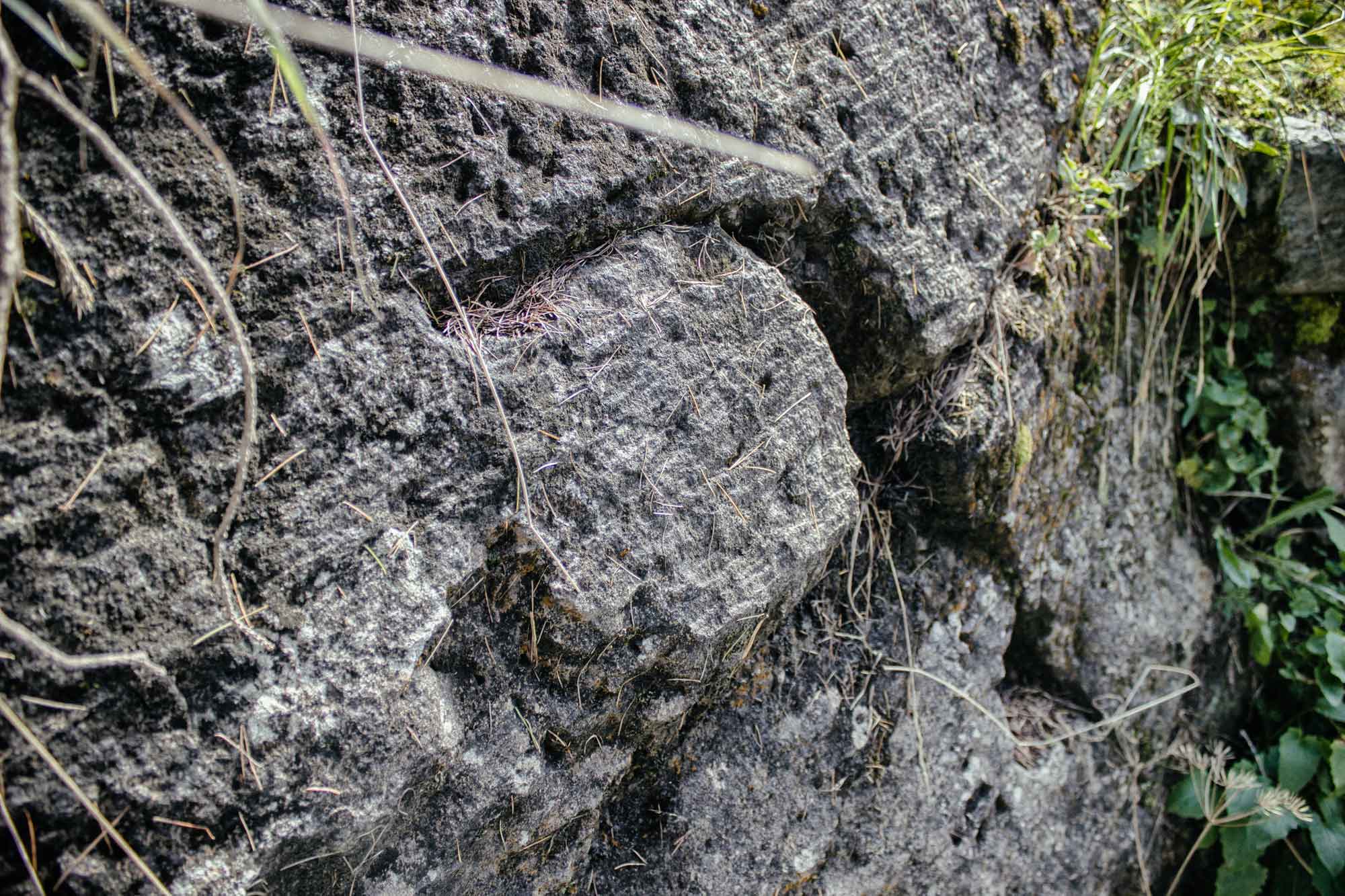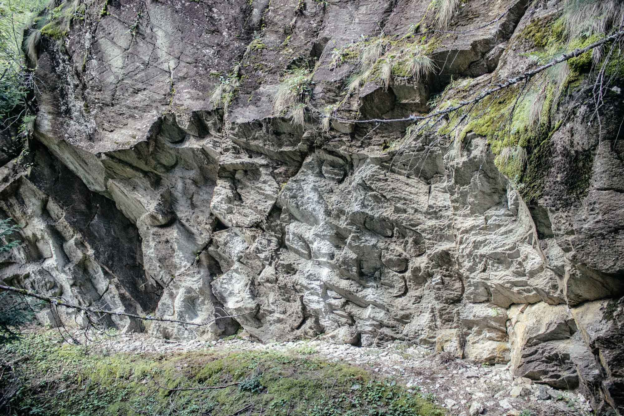 TALCOSCISTO-STEATITE (pietra ollare grigia): costituisce filoni inclusi nelle serpentiniti lungo linee di frattura preesistenti in seguito a circolazione di fluidi idrotermali in fasi tardive dell’Orogenesi Alpina. Il talcoscisto, o steatite quando più compatta e priva di scistosità, è una roccia composta in prevalenza da talco, in subordine è presente magnesite, dolomite, clorite, magnetite e antigorite. La pietra ollare grigia è diffusa prevalentemente sul territorio del comune di Lanzada. Il talco è un minerale con formula chimica Mg3[(OH)2Si4O10], appartenente al gruppo dei fillosilicati. Tale minerale è caratterizzato da abito cristallino lamellare, colore bianco verdastro, untuoso al tatto, tenerissimo (costituisce il primo termine della scala Mohs di durezza dei minerali e può essere scalfito molto facilmente con un’unghia). La pietra ollare presente sul territorio della Valmalenco ha dato luogo allo sviluppo di una storica attività estrattiva che dall’antichità si è protratta fino ai giorni nostri. Attualmente è ancora attiva una cava di pietra ollare verde (cloritoscisto) in località Ui nel comune di Chiesa in Valmalenco. L’attività estrattiva della pietra ollare sul territorio del comune di Lanzada si è sviluppata soprattutto nella località Valbrutta: cave Muntagnëra e cave Sü la Rivä. Queste zone sono attraversate da un importante filone di talcoscisto-steatite, con giacitura sub-verticale e direzione all’incirca est-ovest, affiorante in superficie in più punti. Una piccola lente di cloritoscisto (pietra ollare verde) è stata coltivata nella Valle dell’Ua tra le quote 1320 e 1335 m s.l.m.. I resti di una cava di pietra ollare grigia si trovano sulla bocchetta del Cingiásc a quota 1900 m s.l.m.. Ciò che resta delle antiche cave di pietra ollare è attualmente riconoscibile sul terreno dagli inconfondibili segni che testimoniano la tradizionale tecnica di estrazione del ciapùn e dagli scavi prodotti in avanzamento sul fronte con il tipico piccone a due punte asìsc. La coltivazione del filone di pietra ollare si concentrava nella parte affiorante e più superficiale dello stesso. I resti delle antiche cave mostrano che la coltivazione si sviluppava sia a cielo aperto, con scavo di profonde trincee che seguivano il filone a partire dalla superficie, sia in sotterraneo con scavo di anguste gallerie tróne profonde fino ad un centinaio di metri. E’ interessante osservare che la pietra ollare grigia estratta e lavorata in passato nel territorio del comune di Lanzada si identifica con i giacimenti di talco grigio o “steatite” che, attualmente, rappresentano un’importante risorsa mineraria in Valmalenco con miniere in piena attività nella produzione di talco. Questo particolare aspetto fa capire come la stessa concentrazione di minerali o rocce può costituire, nel corso del tempo, diversi tipi di giacimenti minerari e, di conseguenza, diversi tipi di cave o miniere.