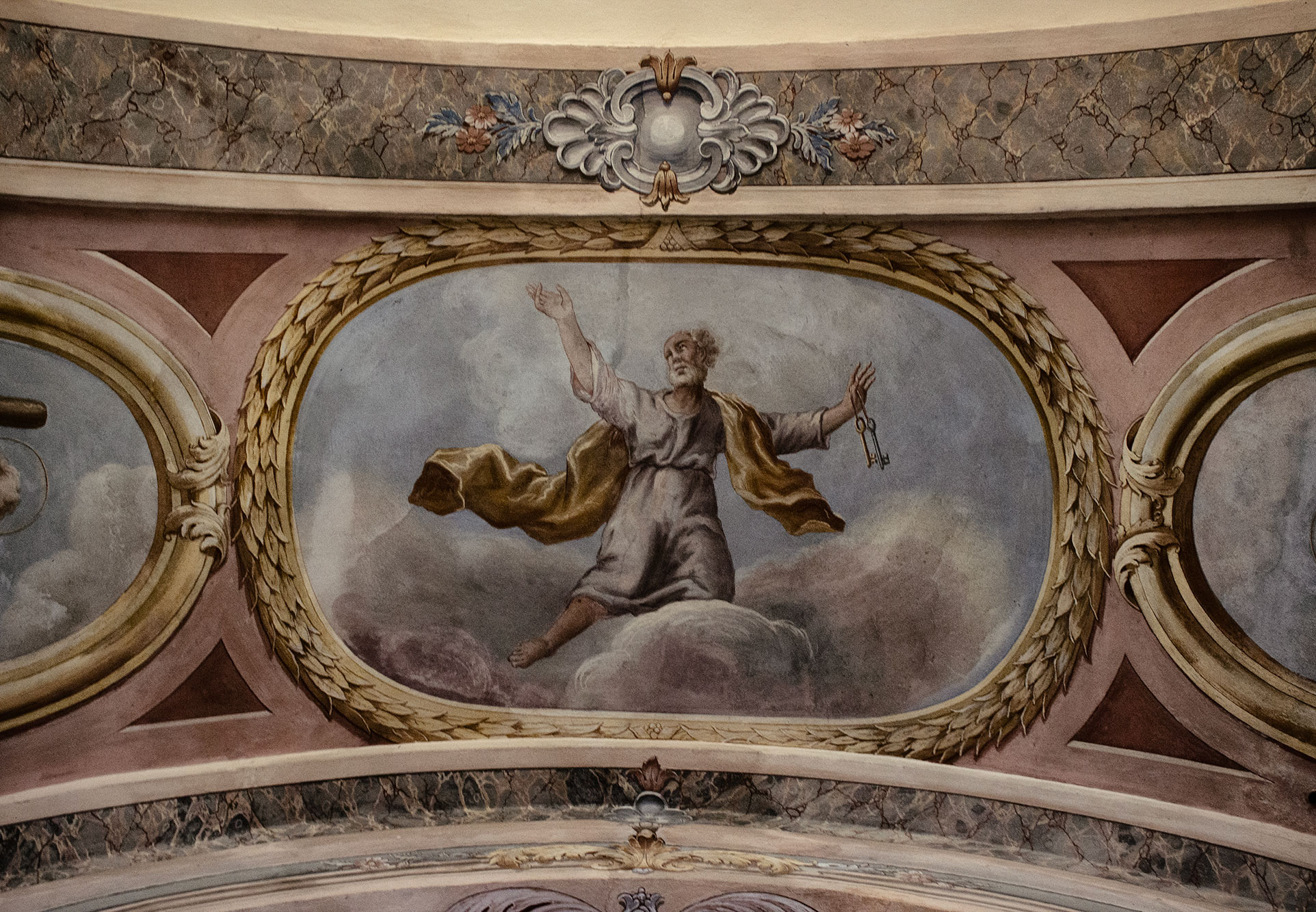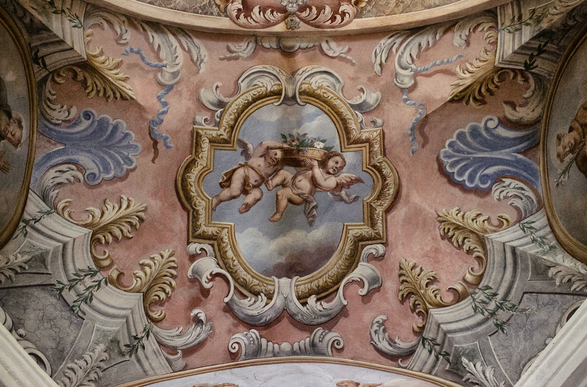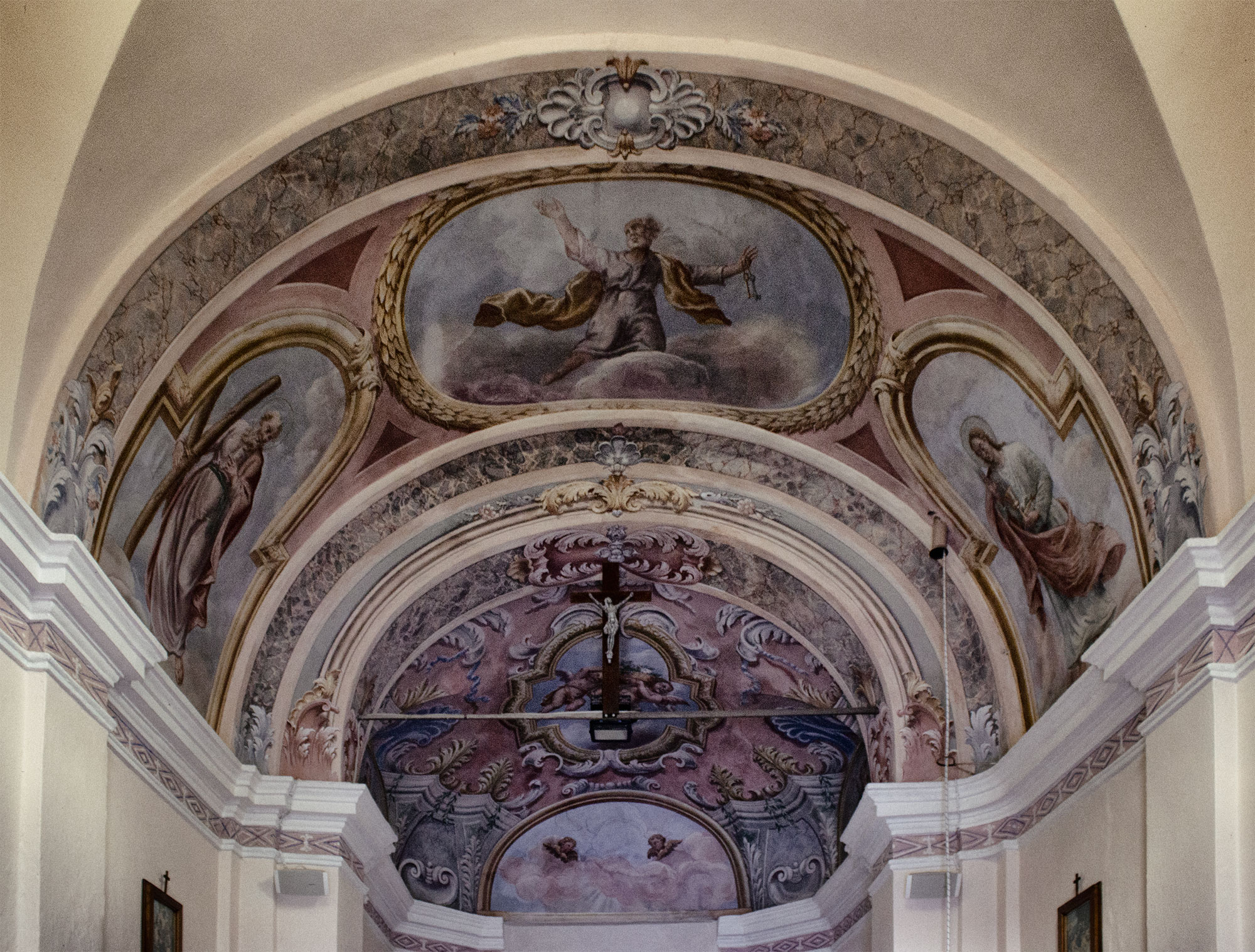 Erminio Dioli // A lui si devono la pala d’altare, l’ancona lignea, il tabernacolo e il paliotto, oggi rimossi in seguito a un restauro recente. Dioli intervenne anche sulla volta del presbiterio, dove eseguì nuove pitture e ritoccò quelle originali del 1720, come testimoniato da una scritta: P. ERMINIO DIOLI FU ZEFIRINO DIPINSE IN PARTE EX NOVO E IN PARTE RITOCCÒ LE PITTURE DEL 1720. LI’ 1955.