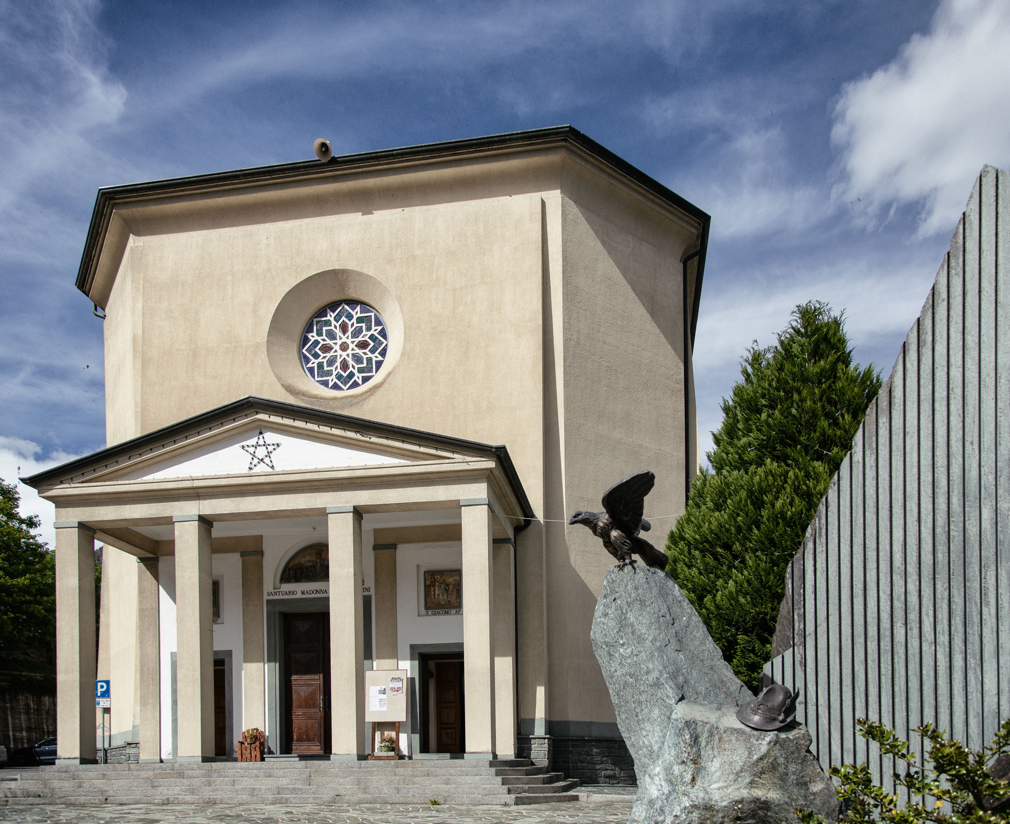 Già arrivando sul sagrato si avverte come la chiesa, oltre la sua funzione sacrale, svolga anche un ruolo civile. Un ampio piazzale vede spesso radunati rappresentanti di vari corpi militari italiani e stranieri che sostano davanti al monumento “all’Alpino d’Italia” e scattano sull’attenti all’alzabandiera. Il monumento, realizzato nel 1984 su disegno dell’artista locale Silvio Gaggi, è in serpentino della Valmalenco. Ai piedi di un masso sormontato dall’aquila e il tipico cappello in bronzo, sono collocate una pietra e della terra portate da Nikolajewka nel 1991, a ricordo della tragica ma anche gloriosa ritirata di Russia.