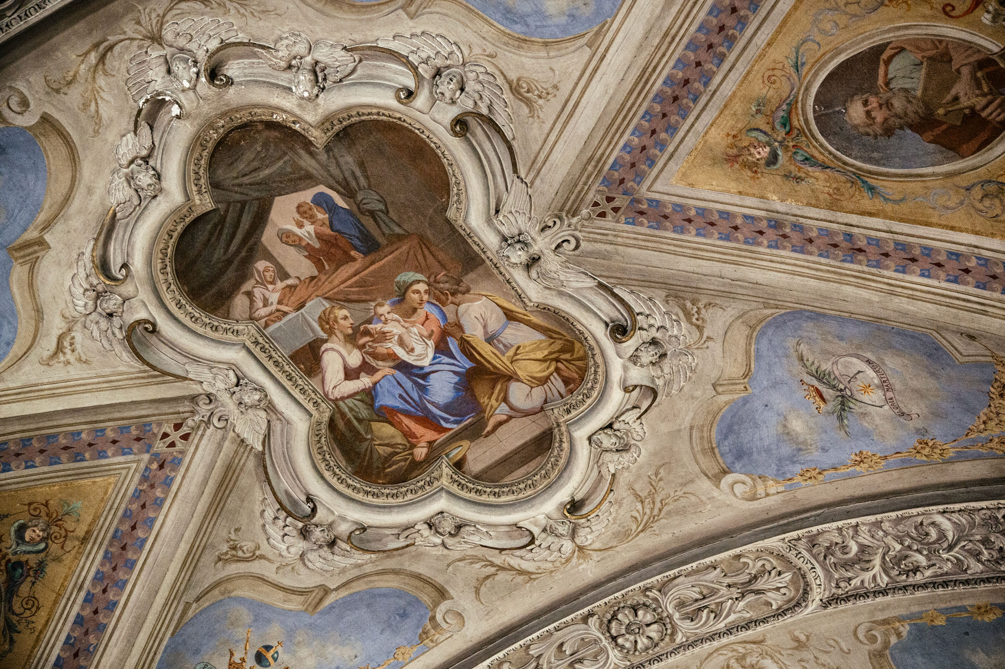 Sulla parete di sinistra è appesa una tela, in un’elegante cornice rinascimentale, raffigurante l’Adorazione di Gesù Bambino da parte della Vergine e dei santi Gottardo, Giacomo, Filippo e Rocco, forse riconducibile a Vincenzo de Barberis (1530). La seconda cappella di sinistra ha sull’altare una ricca ancona a forma di portale con due colonne: al centro è collocata una statua della Madonna. Ai lati dell’ingresso della cappella sono posti due angeli in legno dorato e dipinto (sec. XVIII). Segue il pulpito in legno intagliato sovrapposto ad un confessionale (sec. XVIII).