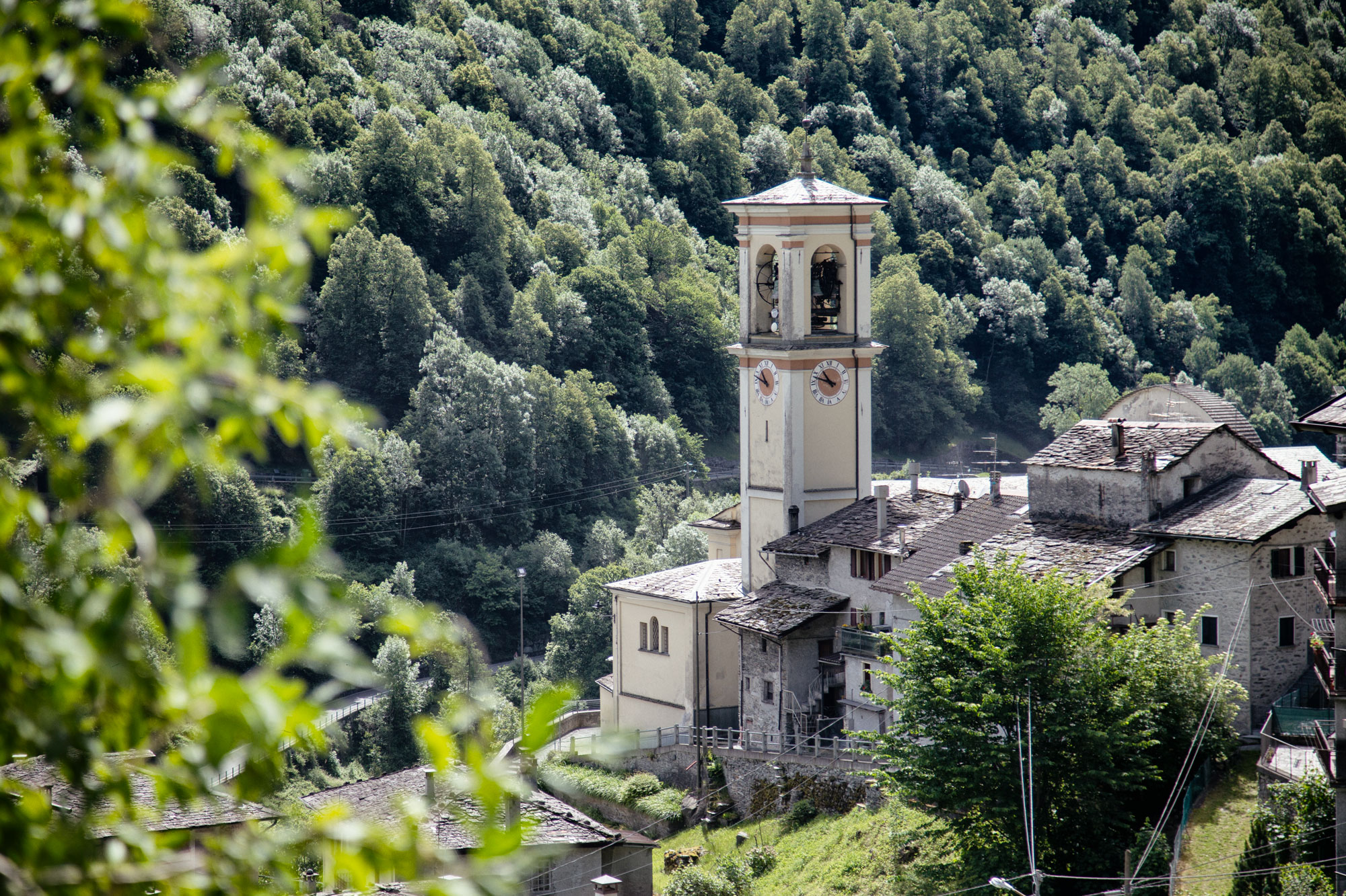 La chiesa, quasi del tutto ricostruita nel 1620 e allungata nel 1919, sorge su un vasto terrapieno e ha davanti un bel piazzale in posizione dominante sulla vallata. Di fronte alla facciata vi è una cappellina con affrescata la Deposizione, dipinta nel 1839 da Giacomo Brazzi e una colonna con in alto una croce di ferro, eretta nel 1765.