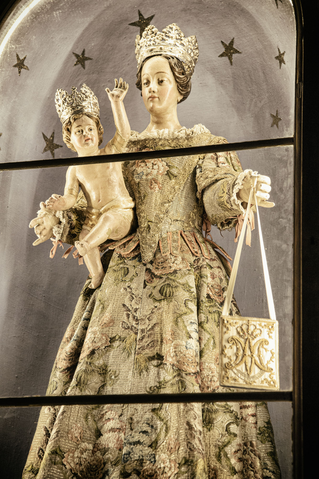 Il piano inferiore ha al centro il portale con i battenti in legno intagliato, datato 1683.