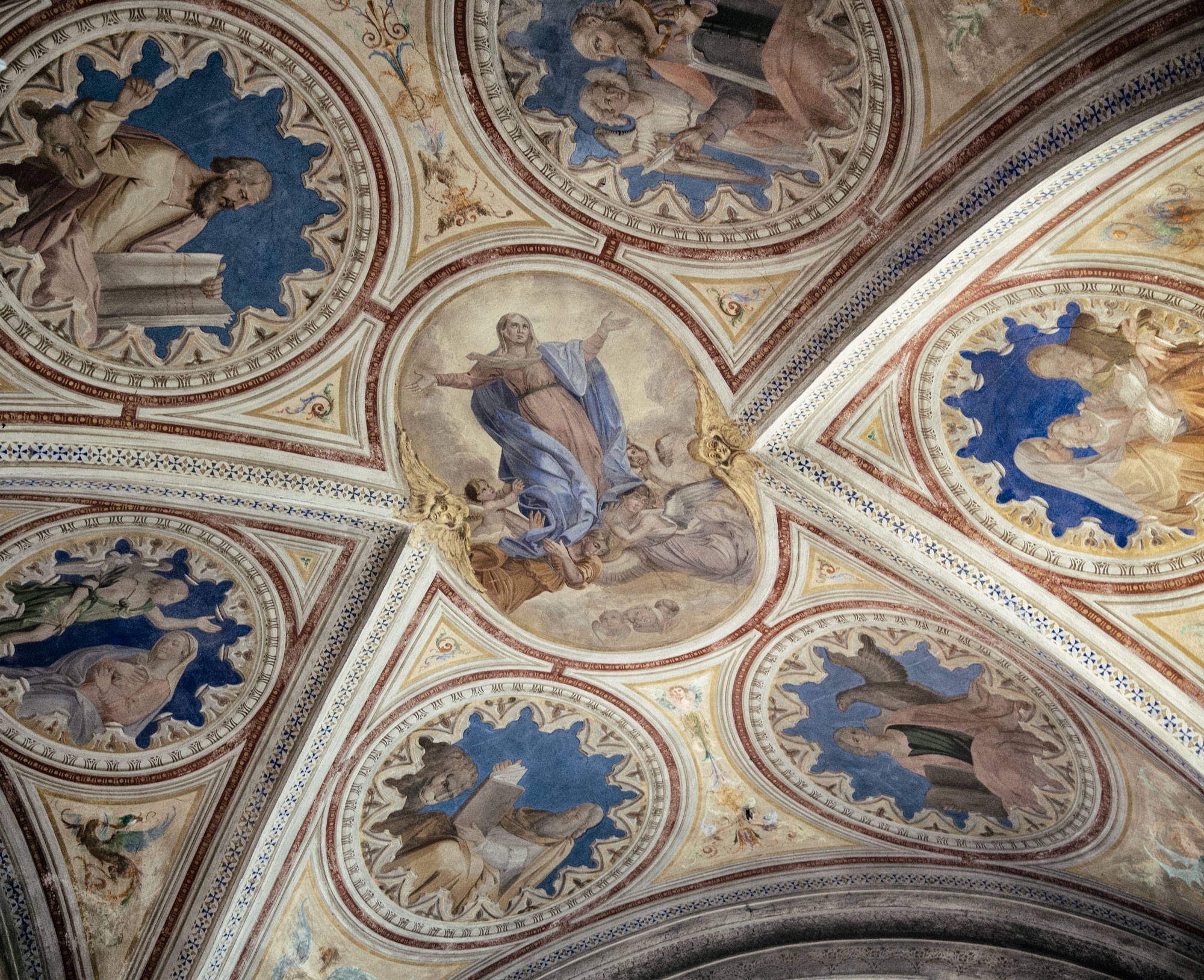 La seconda cappella di destra è decorata di stucchi e ha una nicchia con una statua moderna di Sant’Antonio. Sulla parete di destra sono immurate, entro cornici ovali, tre teste di santi, probabili frammenti di affreschi andati distrutti durante i lavori di ampliamento della chiesa (sec. XVI).