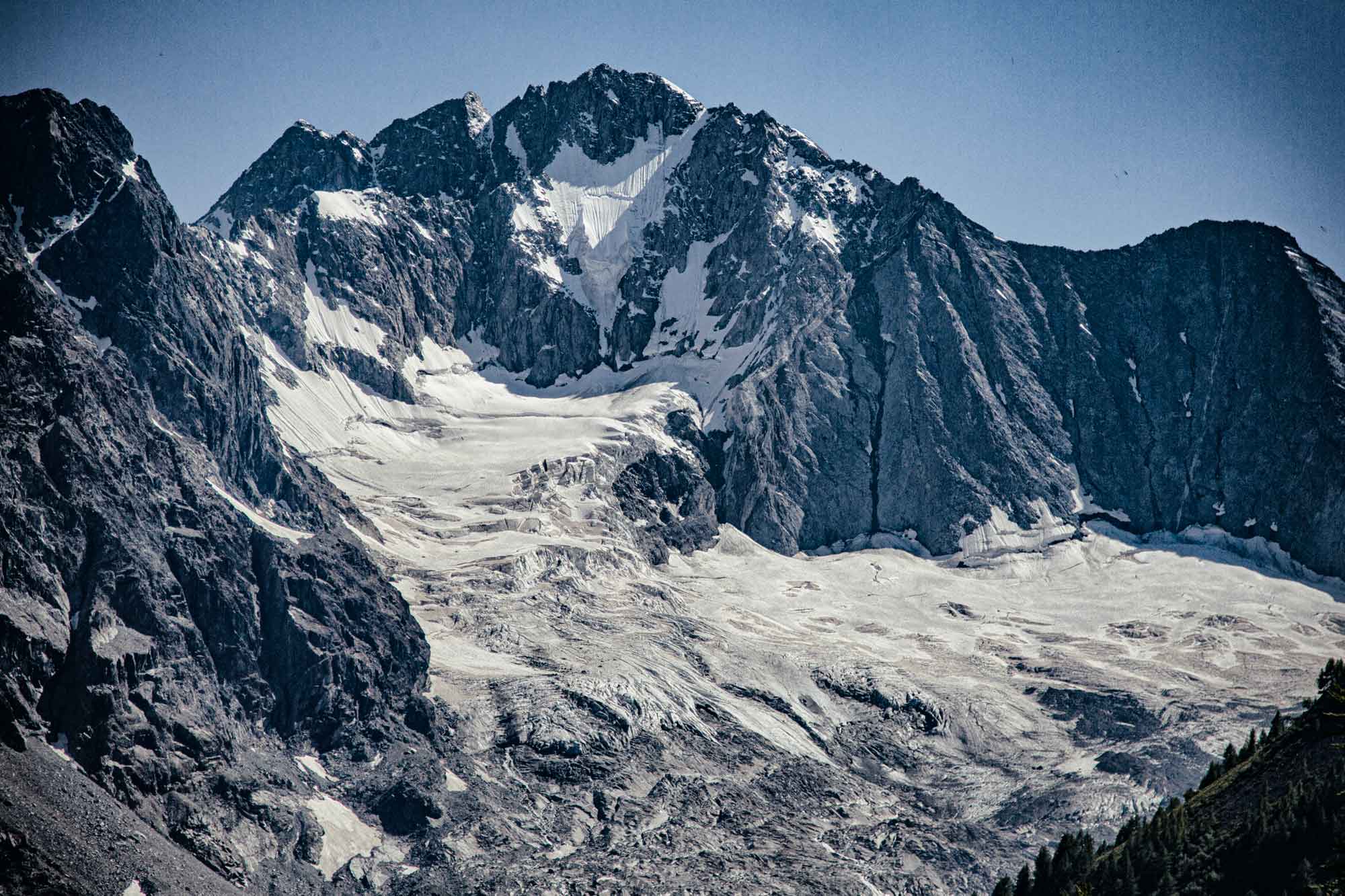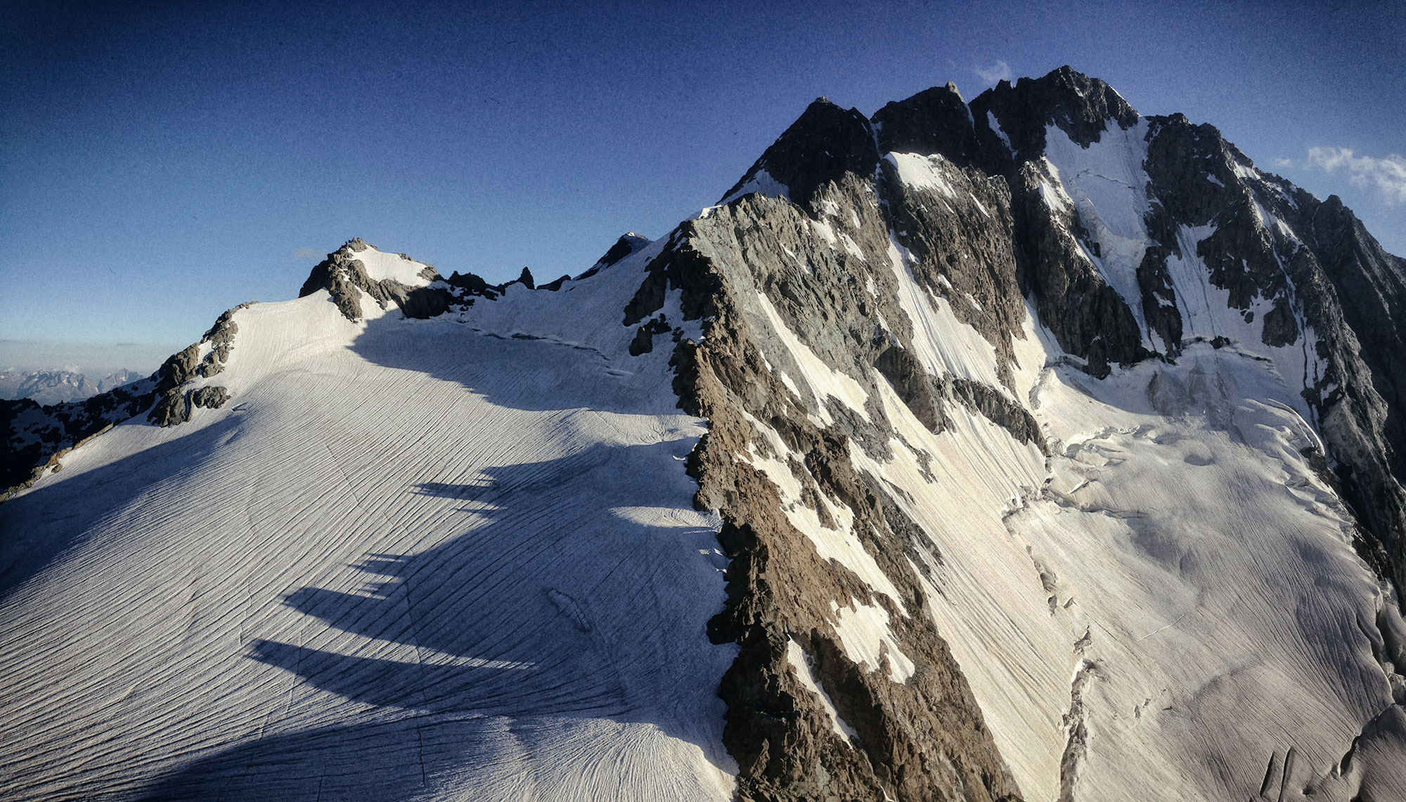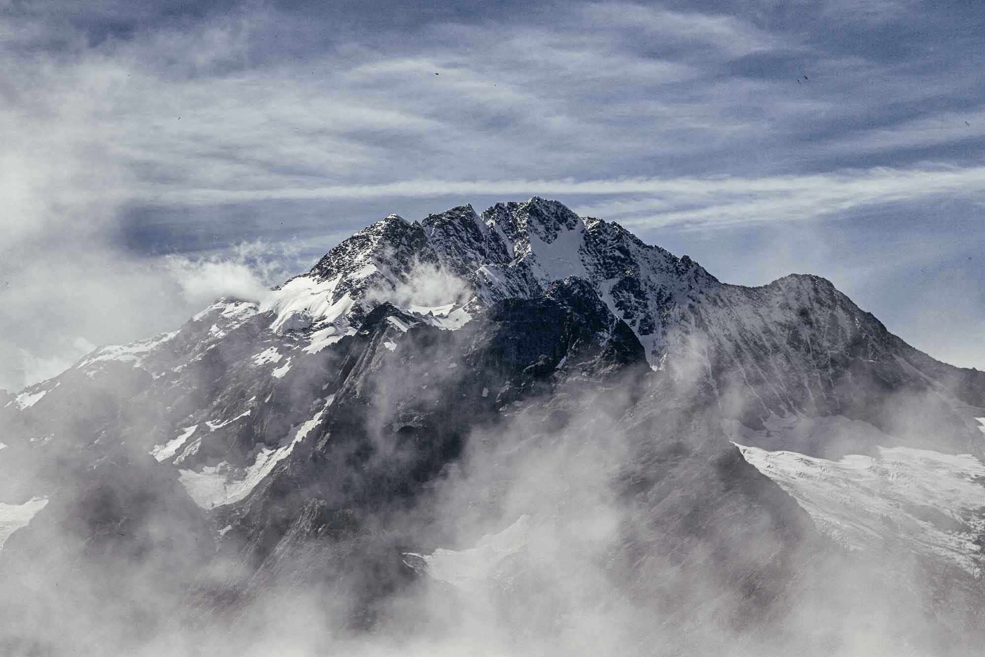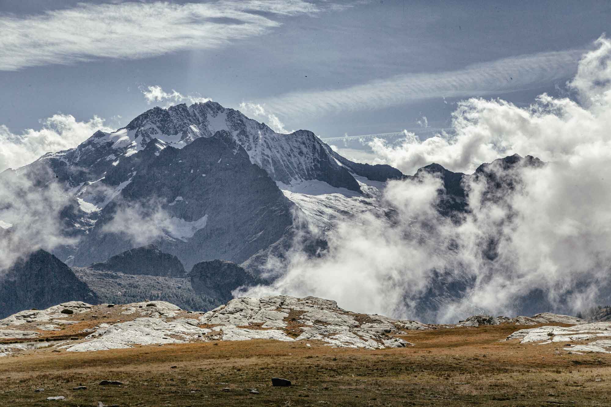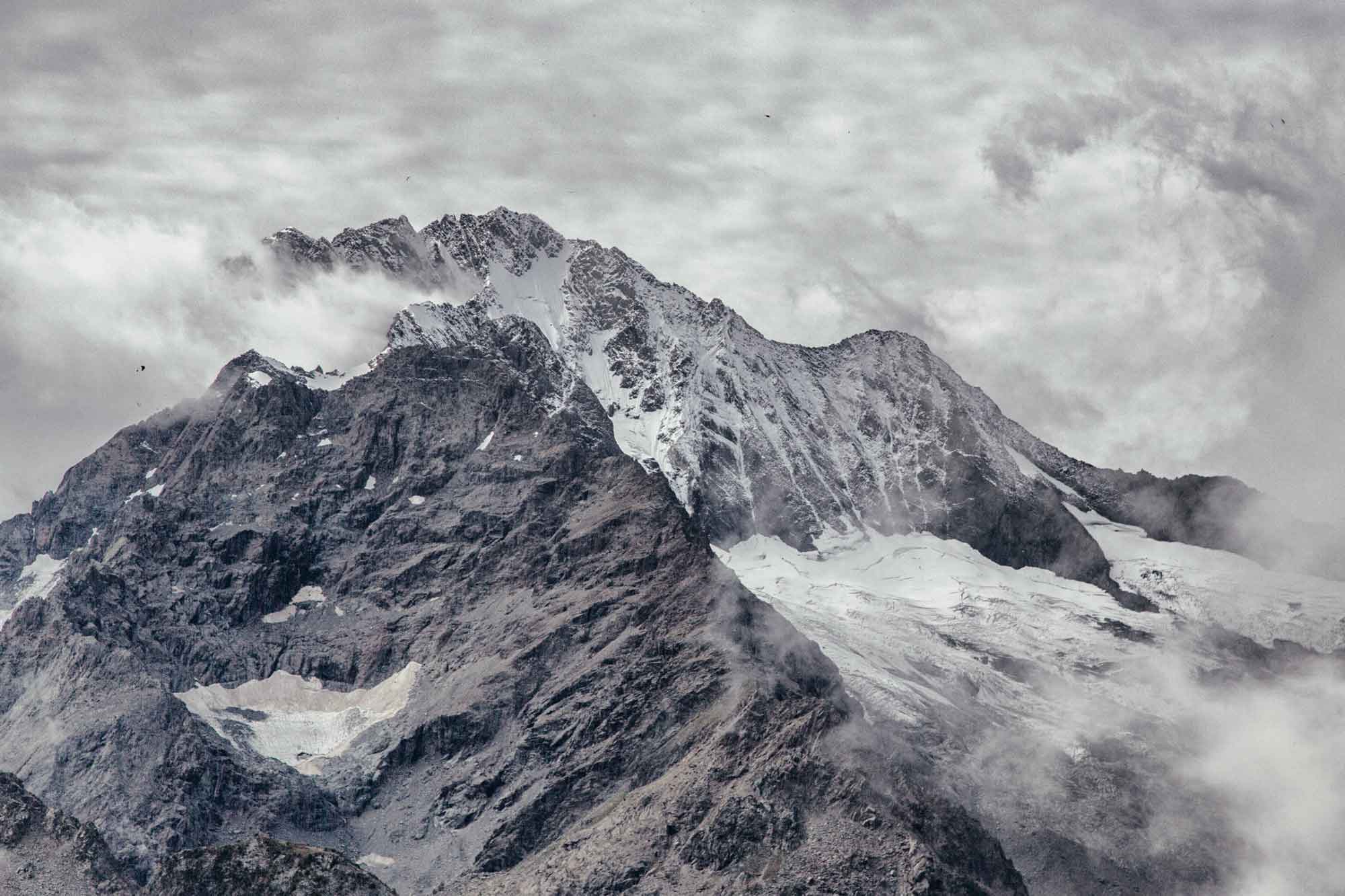La leggenda // Lo chiamavano Pizzo Bello perché pascoli lussureggianti lo coprivano in perpetuo. I pastori non si stancavano mai di guardare la bella montagna e di ammirarla; un giorno un mendicante stanco ed affamato chiese loro un po’ d’ospitalità ma essi lo cacciarono: intenti a rimirare lo splendore del Monte non avevano altri occhi che per lui. Quel mendicante alzò allora una mano, una mano terribile, e maledisse la montagna tanto più cara al loro cuore che l’amore di Dio: le fiamme la avvolsero bruciandola fino alla vetta e il grande bagliore accecò i pastori. Da allora è chiamato monte Disgrazia e le sue rocce sono rosse e l’erba più non vi cresce; i pastori però assegnarono l’antico nome ad una cima più modesta, per consolarsi e per poter venerare di più la gloria del Signore. (1)