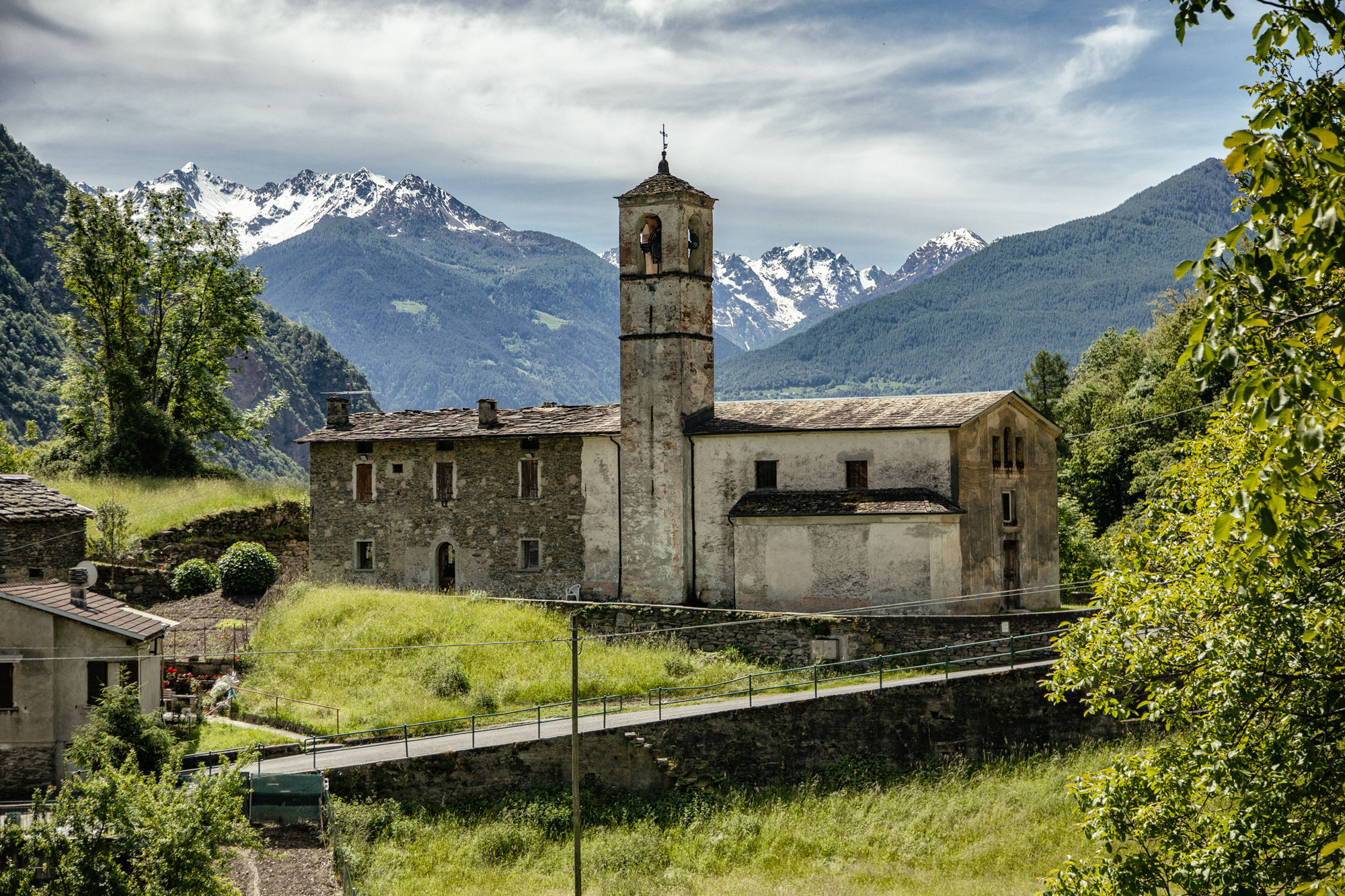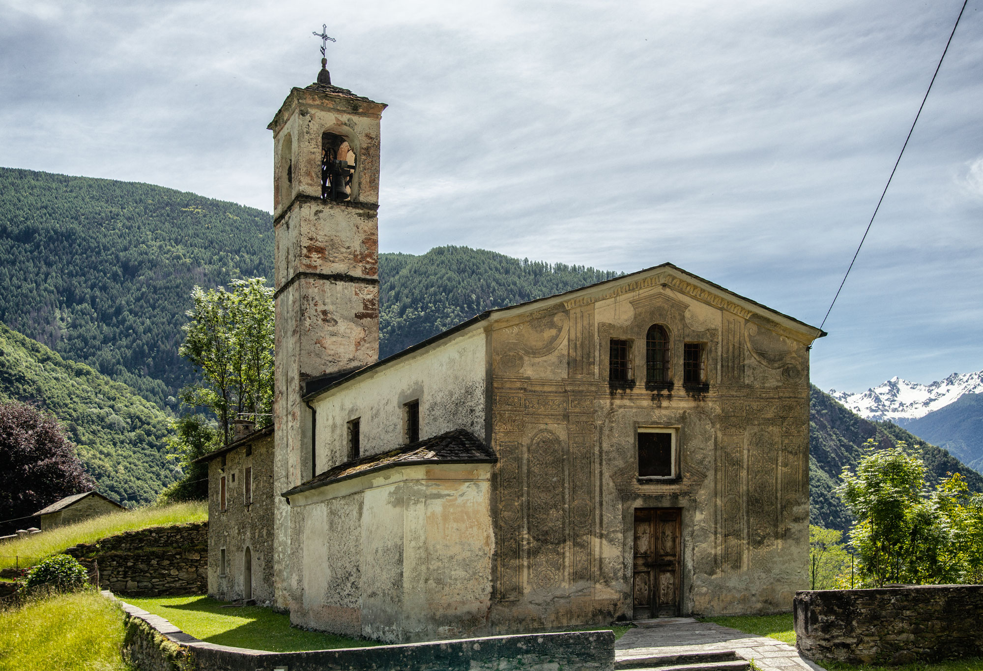 La chiesa di San Pietro a Cagnoletti, nel comune di Torre di Santa Maria, fu eretta agli inizi del XVII secolo e rifatta nel XVIII secolo. Sorge su un dosso panoramico sopra l’antico nucleo abitato e ha un sagrato quadrato con una croce in ferro battuto. La facciata a capanna, con tre finestre e un portale semplice, presenta resti di graffiti decorativi. L’interno custodisce due cappelle laterali, un pulpito in muratura, e un altare ornato da una cornice di G. Antonio Travello. Il presbiterio è delimitato da una balaustra in marmo intagliato. L’altare maggiore vanta un raro paliotto, decorazione frontale che copre la parte anteriore dell’altare, in cuoio sbalzato, dipinto e dorato con al centro la figura di San Pietro. Sopra l’altare, un ciborio ligneo a due piani con colonnine tortili e una statua del Redentore. In alto, una tela del XVII secolo raffigura Cristo con San Pietro e gli apostoli, testimonianza dell’antica devozione locale.