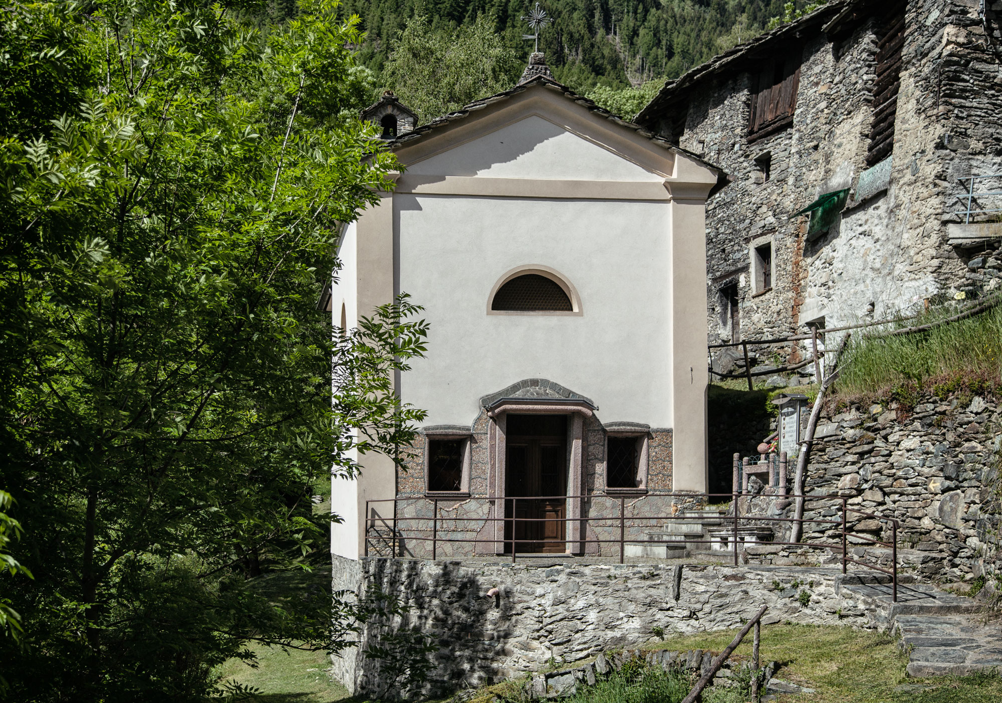 La Chiesa della Madonna del Rosario è una piccola chiesa storica in Valmalenco, edificata nella prima metà del XIX secolo, probabilmente nel 1838. Questa data è riportata su una tavoletta in legno oggi incassata nella parete destra del presbiterio, un tempo forse collocata sull’altare. L’iscrizione ricorda la consacrazione della chiesa, avvenuta il 17 agosto, ad opera dell’allora Arcivescovo di Milano. Completamente ristrutturata nel 1973, la chiesa presenta interni rivestiti in legno, che creano un ambiente raccolto e suggestivo. Nella parete di fondo è stata ricavata una nicchia decorata con pietre colorate, al cui interno è custodita una preziosa statua lignea della Madonna del Rosario: la Vergine Maria, con in braccio il Bambino Gesù benedicente, regge con la mano destra la corona del Rosario, simbolo di devozione mariana. L’altare in serpentino della Valmalenco, lucido e raffinato, è arricchito da un bordo in pietra ollare decorato con simboli eucaristici, un cervo che si disseta alla fonte e l’incisione commemorativa: Don Giovanni Borla Parroco 1973.