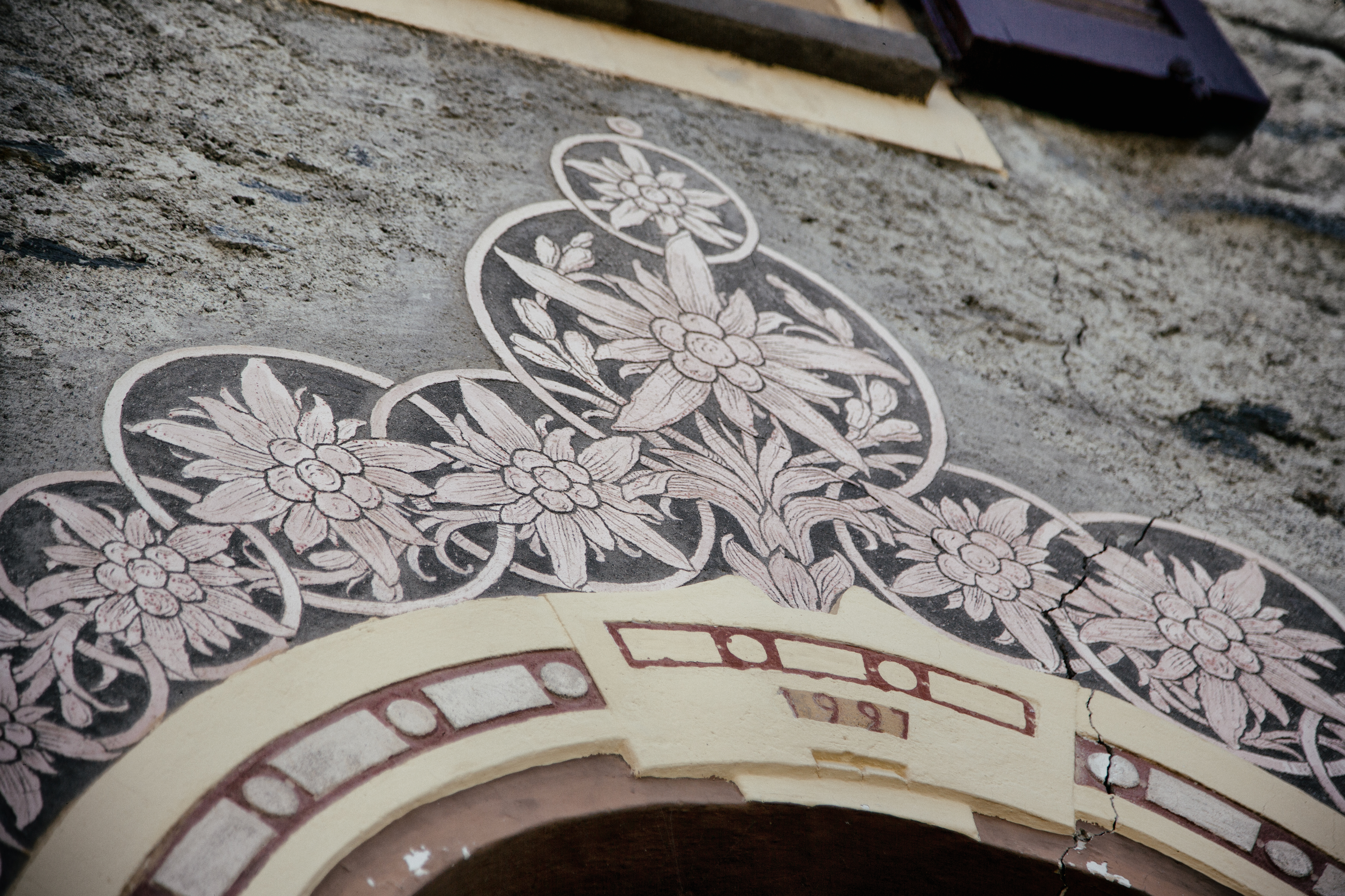 Il motivo floreale della stella alpina, elemento distintivo dell’iconografia montana, è tra i più ricorrenti nello stile Malenchino sviluppato da Dioli. Questo decoro esemplifica l’attenzione dell’artista verso la natura alpina e la volontà di integrare arte, architettura e identità territoriale in un linguaggio decorativo coerente e riconoscibile.