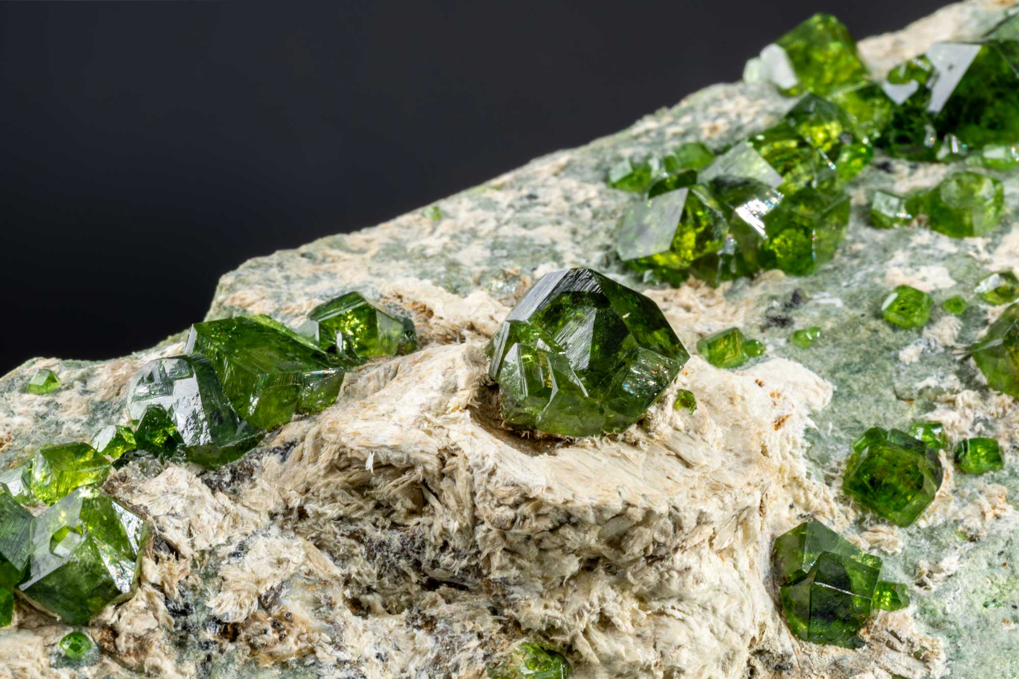 È un minerale secondario che si trova nelle fessure delle serpentiniti assieme all’amianto, sia nascosto tra le sue fibre sia impiantato sulle pareti rocciose. Dunque, i demantoidi ci sono dove c’è l’amianto, ma non è detto che sia vero il contrario.