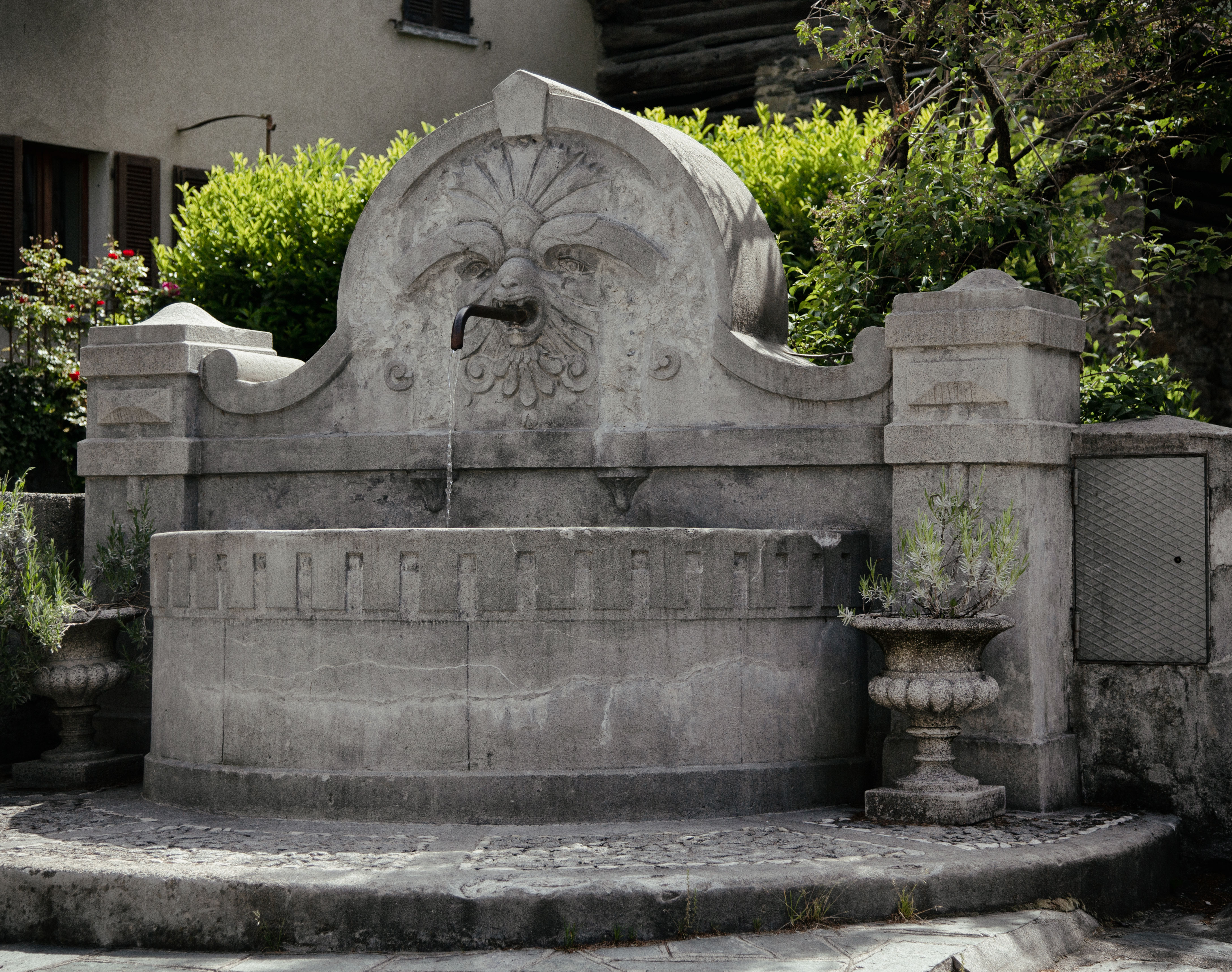 Opera monumentale in pietra, realizzata tra il 1930 e il 1932, la fontana si distingue per la sua struttura massiccia, severa e perfettamente simmetrica, caratteristiche tipiche dello stile Malenchino sviluppato da Erminio Dioli. Al centro spicca un mascherone scolpito dal volto ibrido, metà umano e metà creatura mostruosa, con richiami formali ai draghi allegorici che decorano il Castello Dioli e possibili riferimenti iconografici ai tritoni delle fontane barocche romane del Seicento.