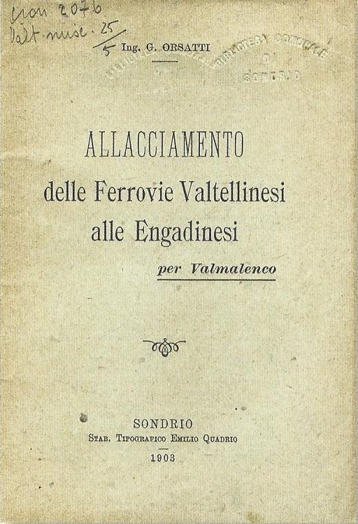 Redatta con cura e dal linguaggio meticoloso e scarno, la breve relazione è opera dell’ingegner Giacinto Orsatti: stampato con i tipi del Quadrio nel 1903, Allacciamento delle Ferrovie Valtellinesi alle Engadinesi per Valmalenco rappresenta l’esito locale di un dibattito e di una tendenza che tra Ottocento e Novecento coinvolse tutte le nazioni prossime al diaframma alpino. La necessità di implementare l’osmosi di merci e persone attraverso le Alpi sollecitò Francia, Confederazione Elvetica, Germania, Regno d’Italia e Impero Austroungarico a trovare dei mezzi di trasporto e delle vie di comunicazione alternative alle tradizionali, che si rivelavano ormai obsolete e inadatte a veicolare gli imponenti flussi commerciali di un continente in esponenziale aumento demografico ed economico. Fu dunque la seconda delle due grandi scoperte che caratterizzarono il XIX secolo – la fotografia e la putrella “a doppia T” – a fornire il veicolo ideale per il trasporto rapido e sicuro di grandi quantitativi di merci e persone attraverso territori geomorfologicamente ostili: il treno.