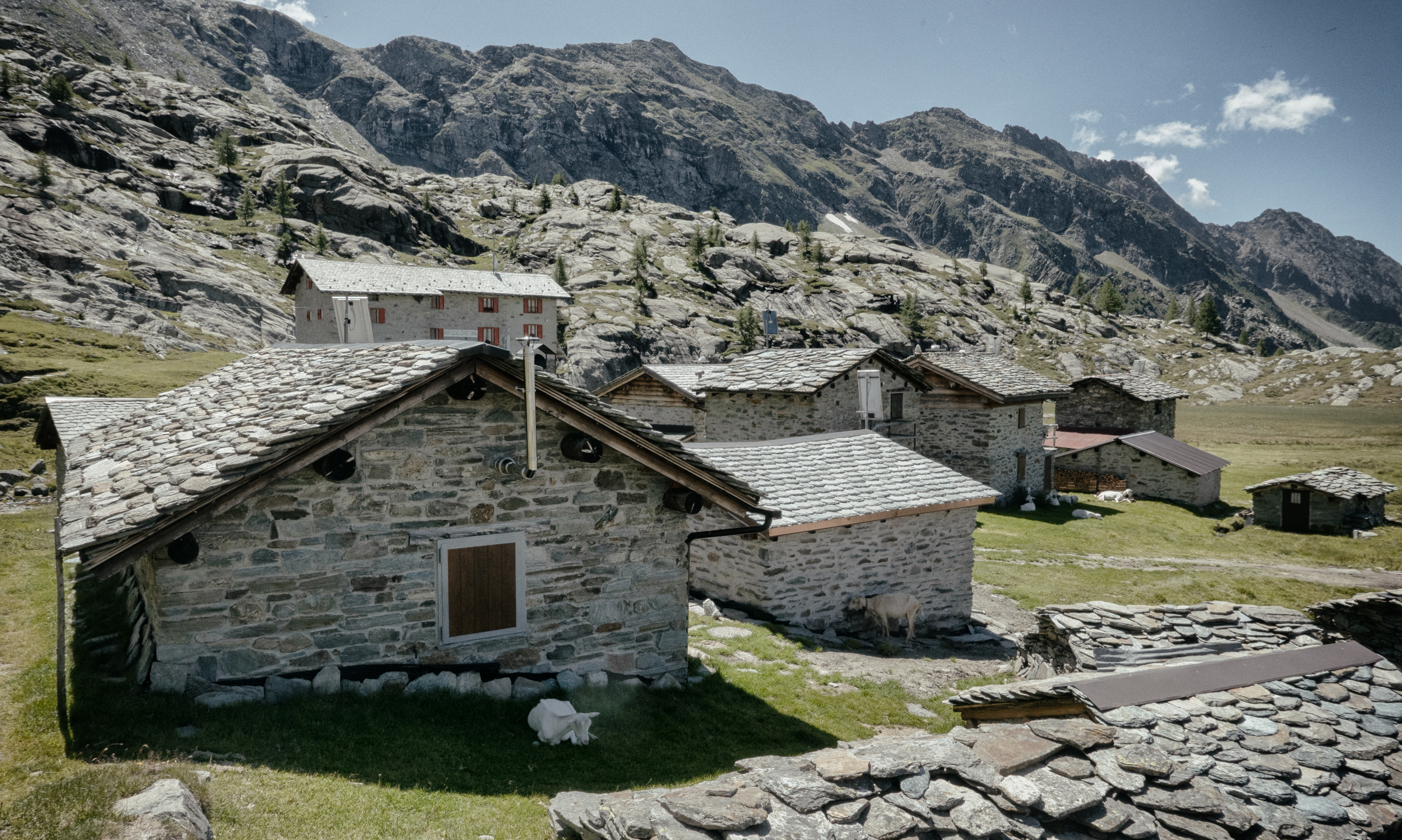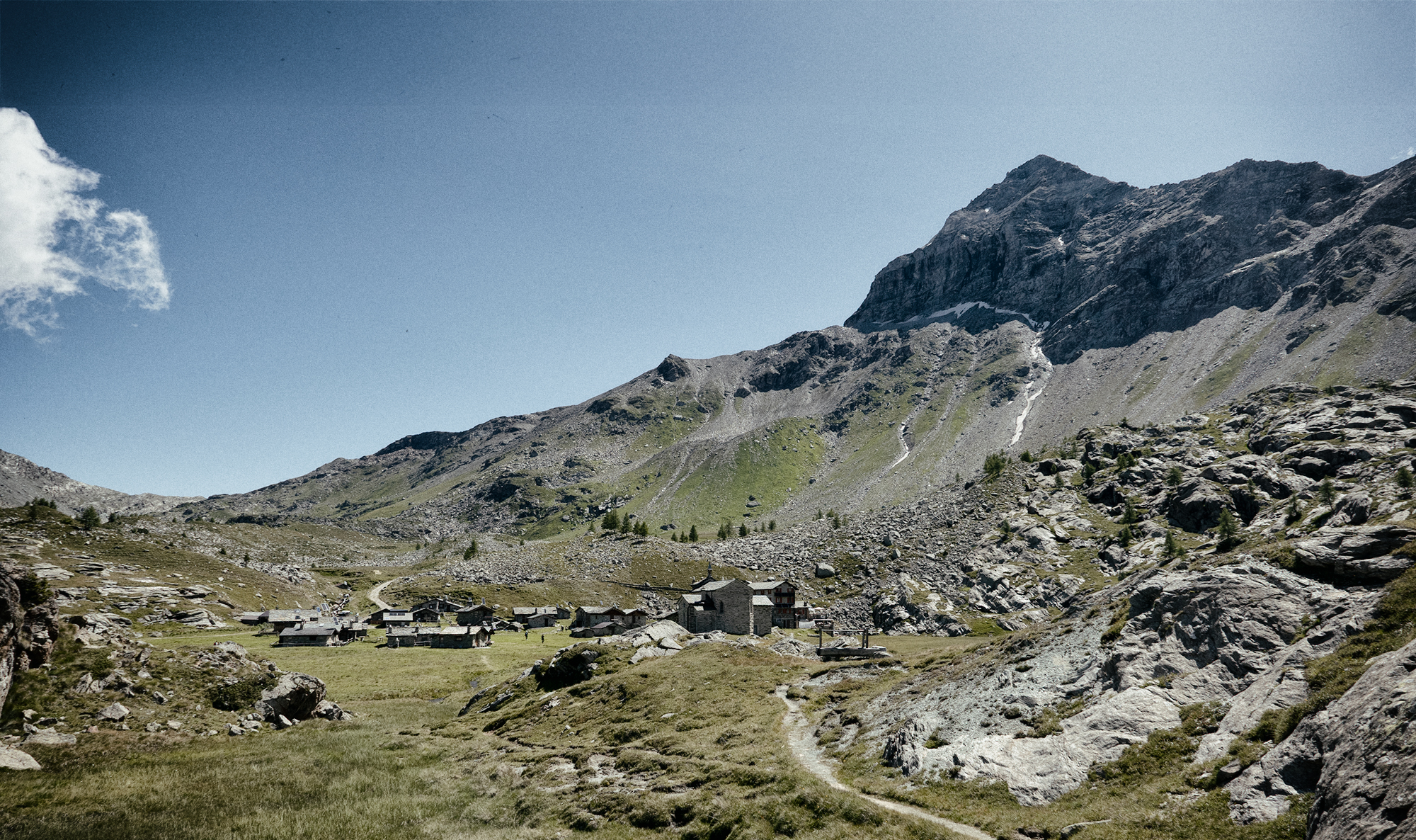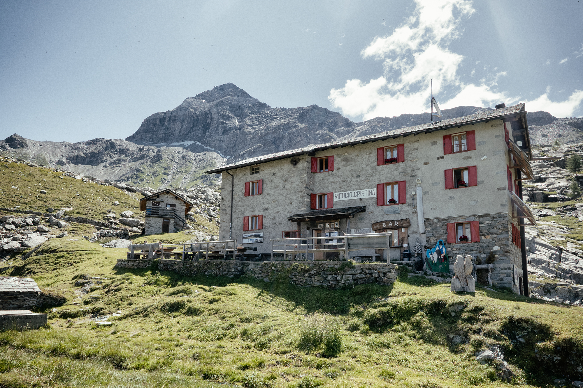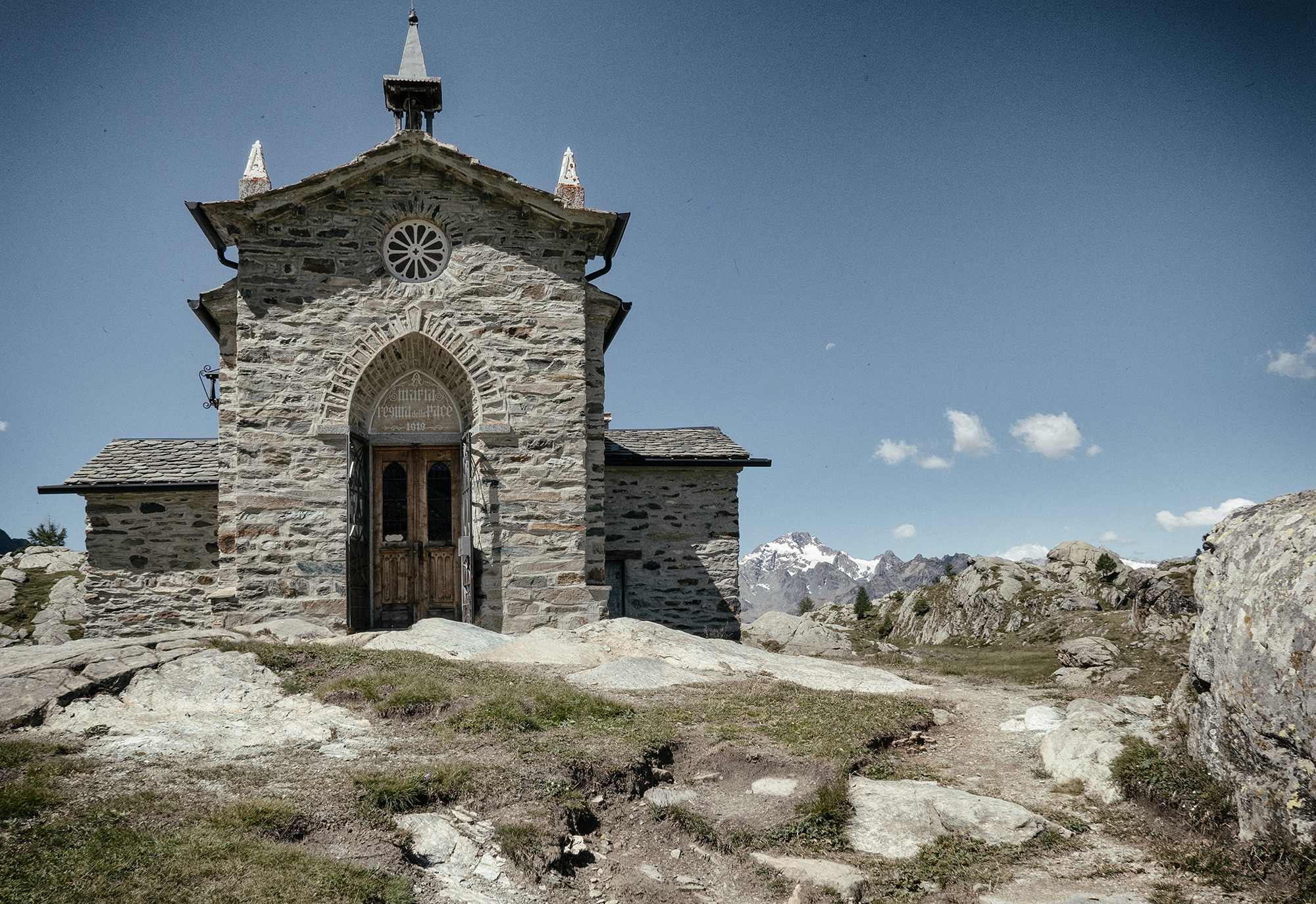 La chiesetta della Madonna della Pace // La facciata è a capanna, delimitata dall’aggetto della struttura di copertura del timpano con gronde piane, ed è coronata in colmo da un baldacchino ligneo. Il portale è ad arco a sesto acuto strombato, con cancellata in ferro a due battenti, aggiunta a due battenti in larice, sormontati da un soprapporta su cui è scritto: Maria Regina della Pace - 1919. L’interno è a pianta rettangolare con abside poligonale. Sulla parete destra della navata sono riportate due rappresentazioni pittoriche policrome rappresentanti rispettivamente Il buon Pastore e S. Antonio Abate. Con la stessa tecnica è rappresentato sulla parete sinistra Il miracolo della sorgente. L’altare ligneo neo-gotico è stato intagliato gratuitamente da Zeffirino Dioli e il tabernacolo da suo figlio Erminio. Sulla parete destra si trova un quadro rappresentante una Madonna, opera del 1919 di Achille Jemoli. La chiesa fu costruita nel 1919. Tutto il materiale venne portato direttamente a spalla da Caspoggio, distante circa 15 km, da quota 1098 a quota 2287. Nel 1929-31 furono aggiunti i corpi laterali e l’abside. Fu rinnovata nel 1992-95 con il rifacimento del tetto e dell’intonaco esterno, e la formazione del pavimento in lastre di dorato e del portale in serizzo della Valmasino.