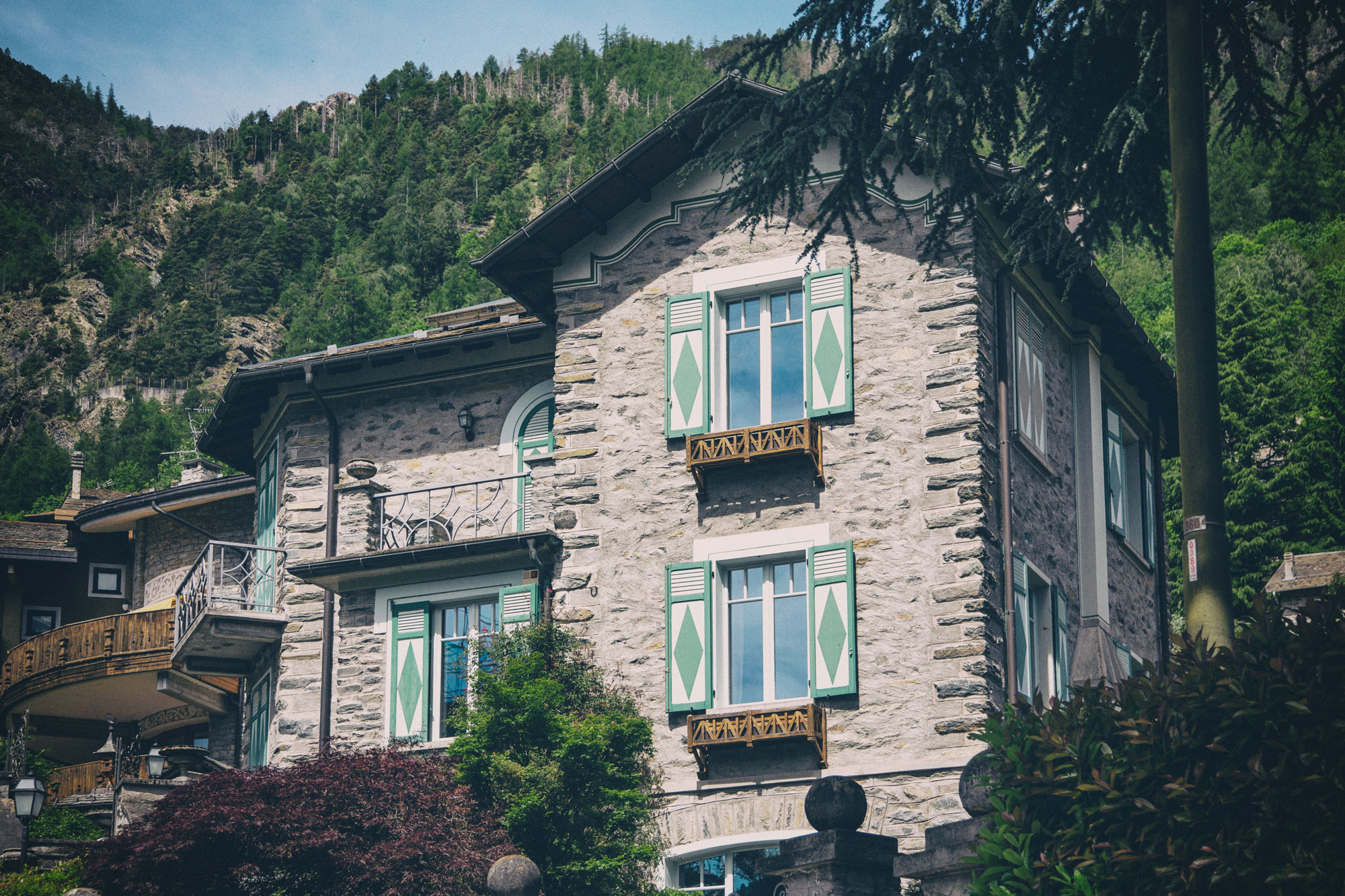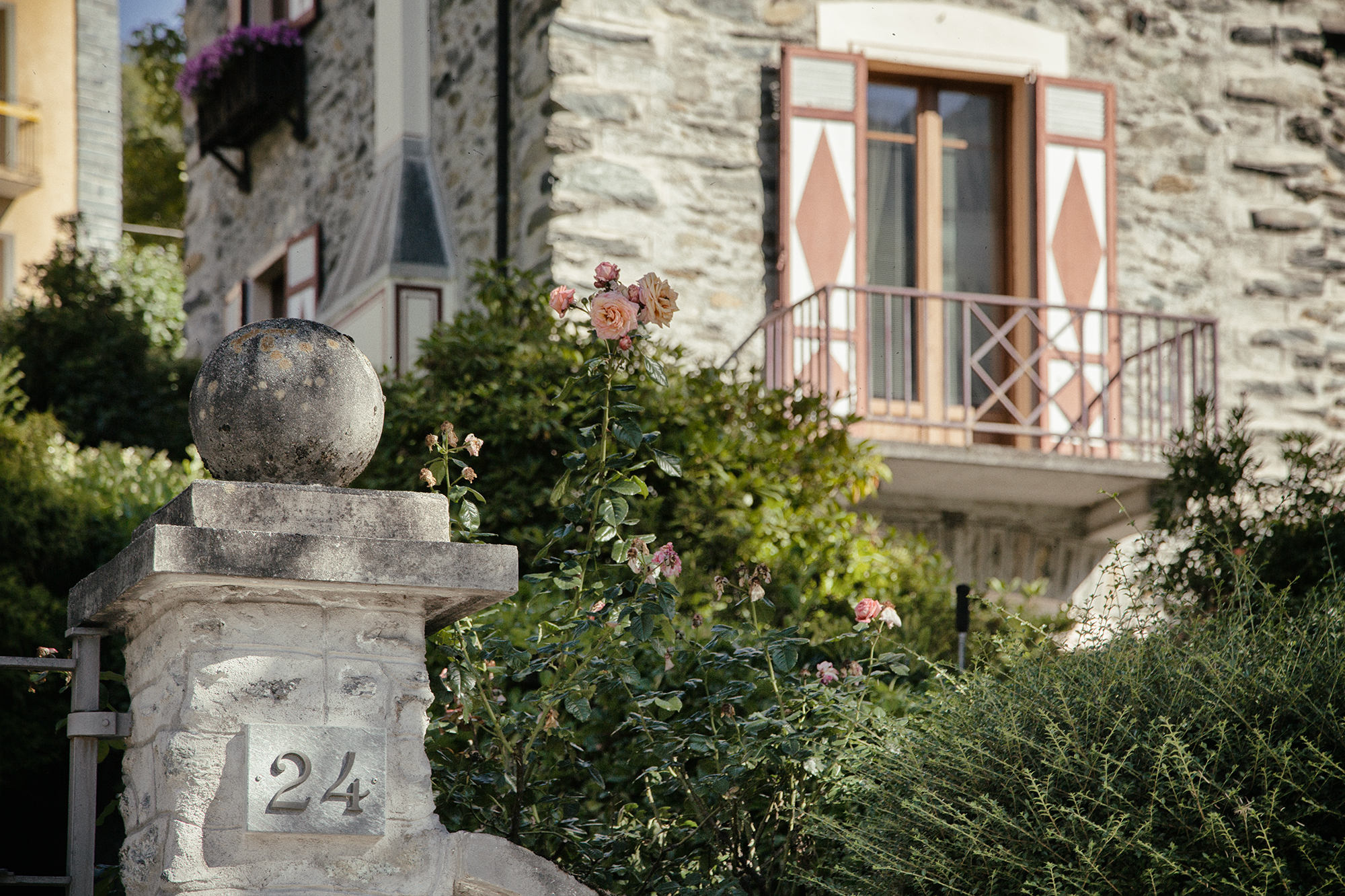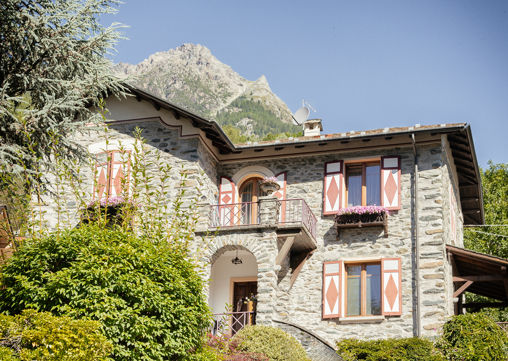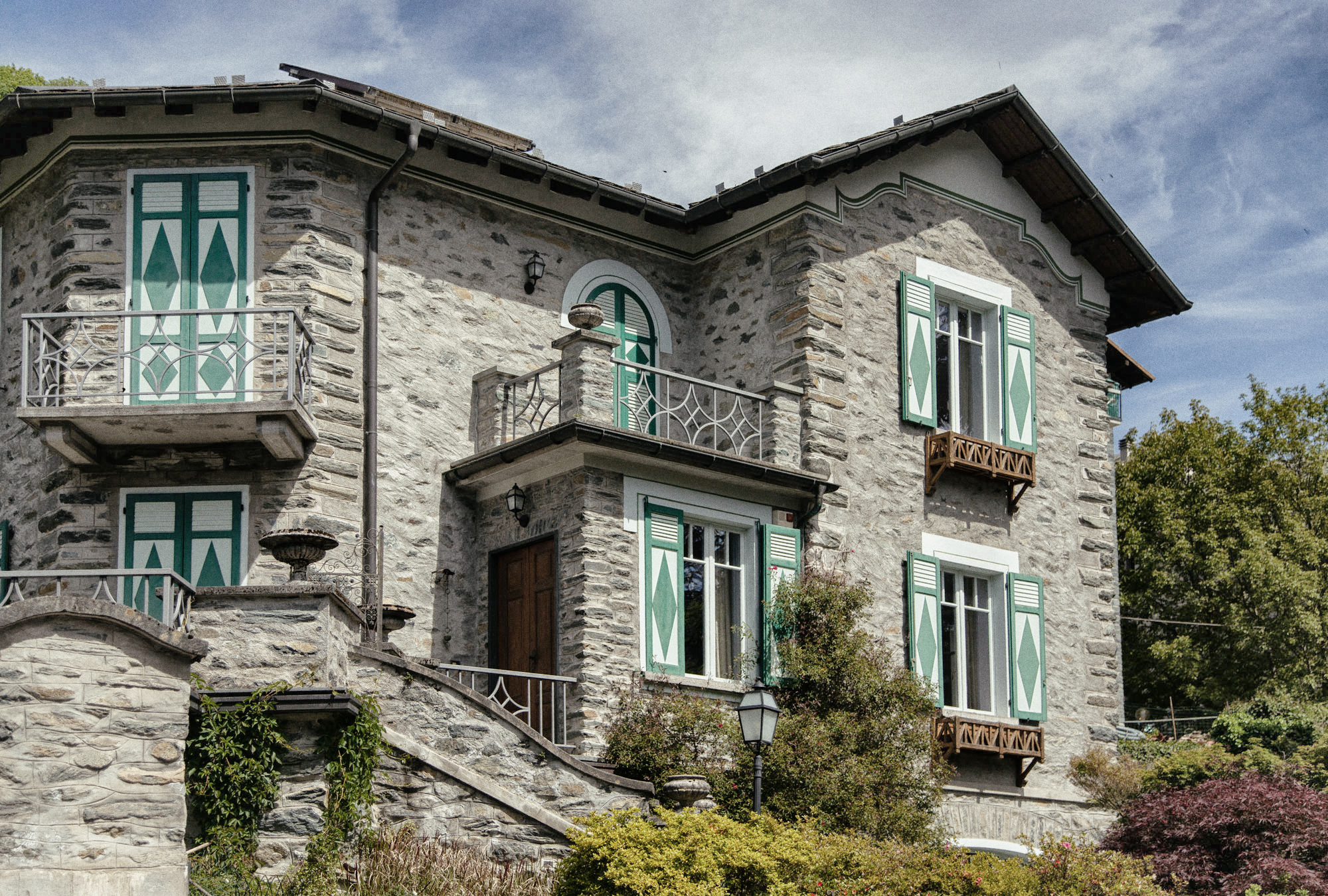 I balconi sono ornati con inferriate in ferro battuto a motivi geometrici in stile Ridgeo, basati su diagonali incrociate, mentre una fascia decorativa sotto il tetto richiama lo stile ibrido tra Liberty e Rococò, con volute leggere e andamento continuo. I muri di cinta, che seguono l’inclinazione dei giardini, sono arricchiti da pilastrini sormontati da sfere, elemento distintivo dell’estetica decorativa di Dioli.