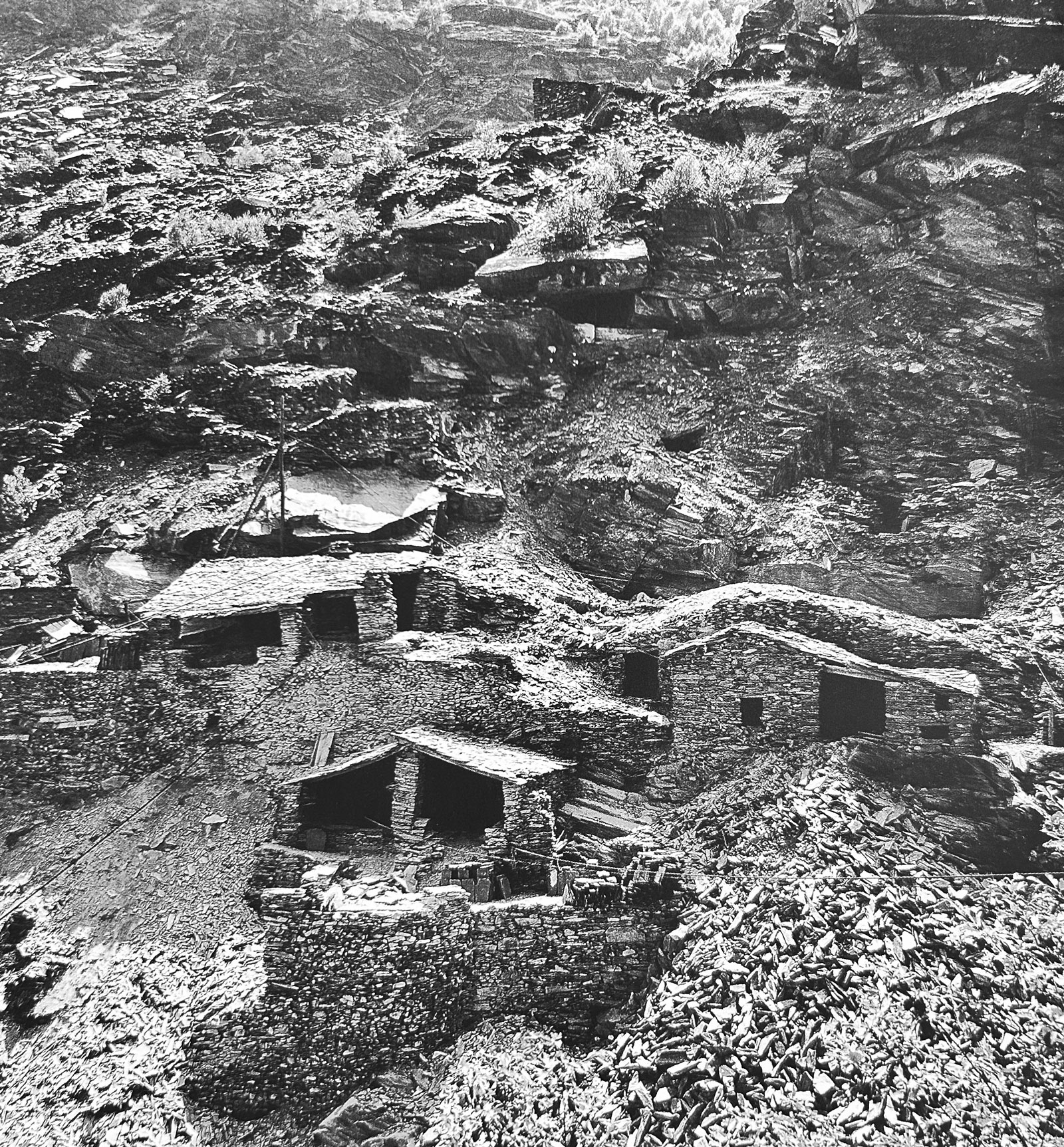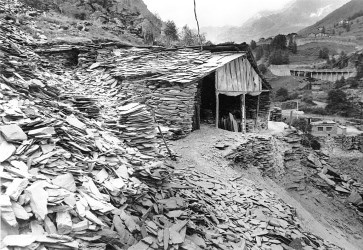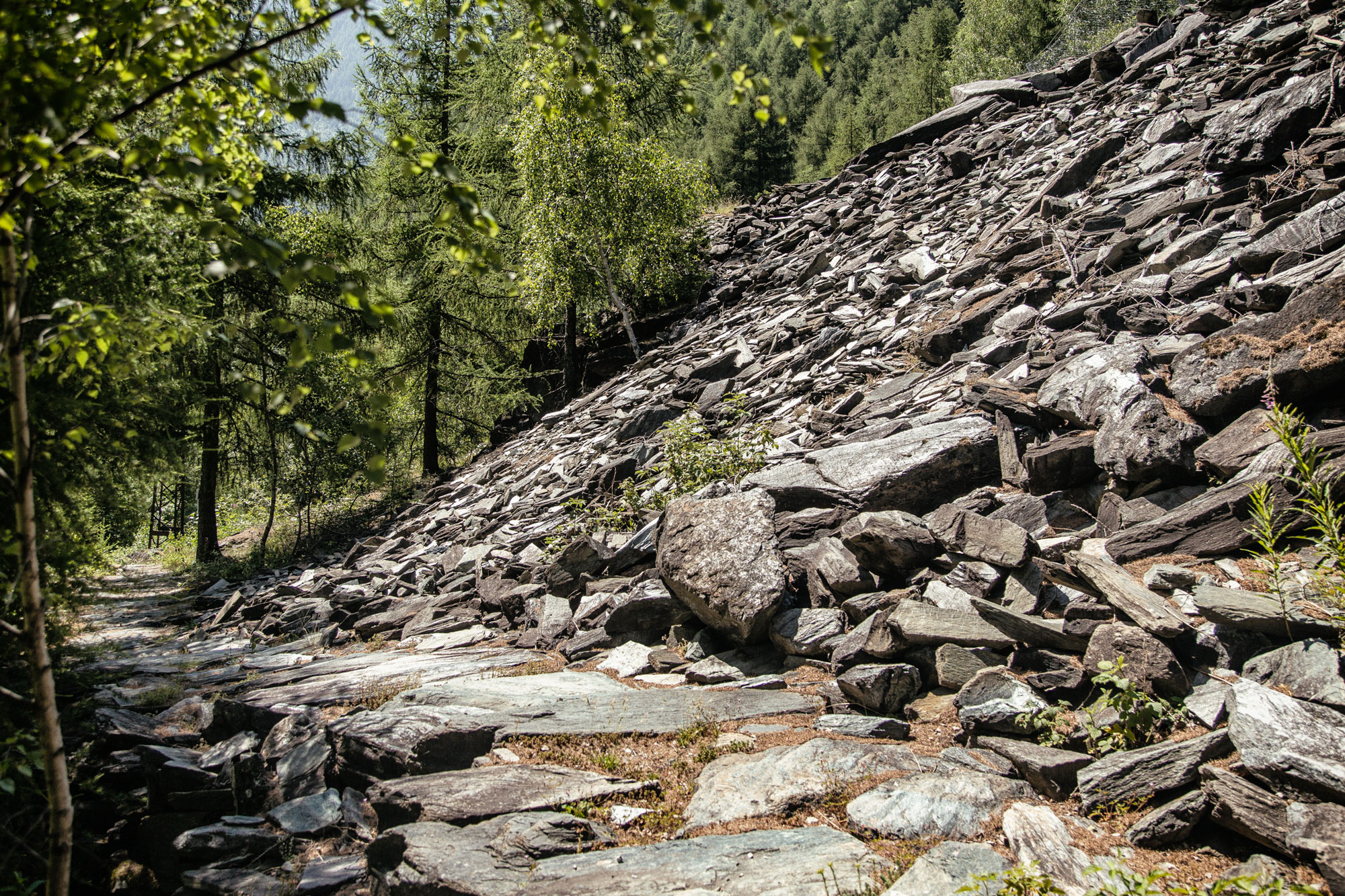 L’attuale Giovello si presenta come un versante segnato da discariche di Serpentino, che celano il ricordo di un’intensa attività estrattiva sotterranea. In superficie restano le tracce di quel passato: gli imbocchi delle gallerie, detti buchèl, e i ruderi delle antiche teciàde, tettoie in pietra a secco dove si lavoravano i blocchi di serpentinoscisto.