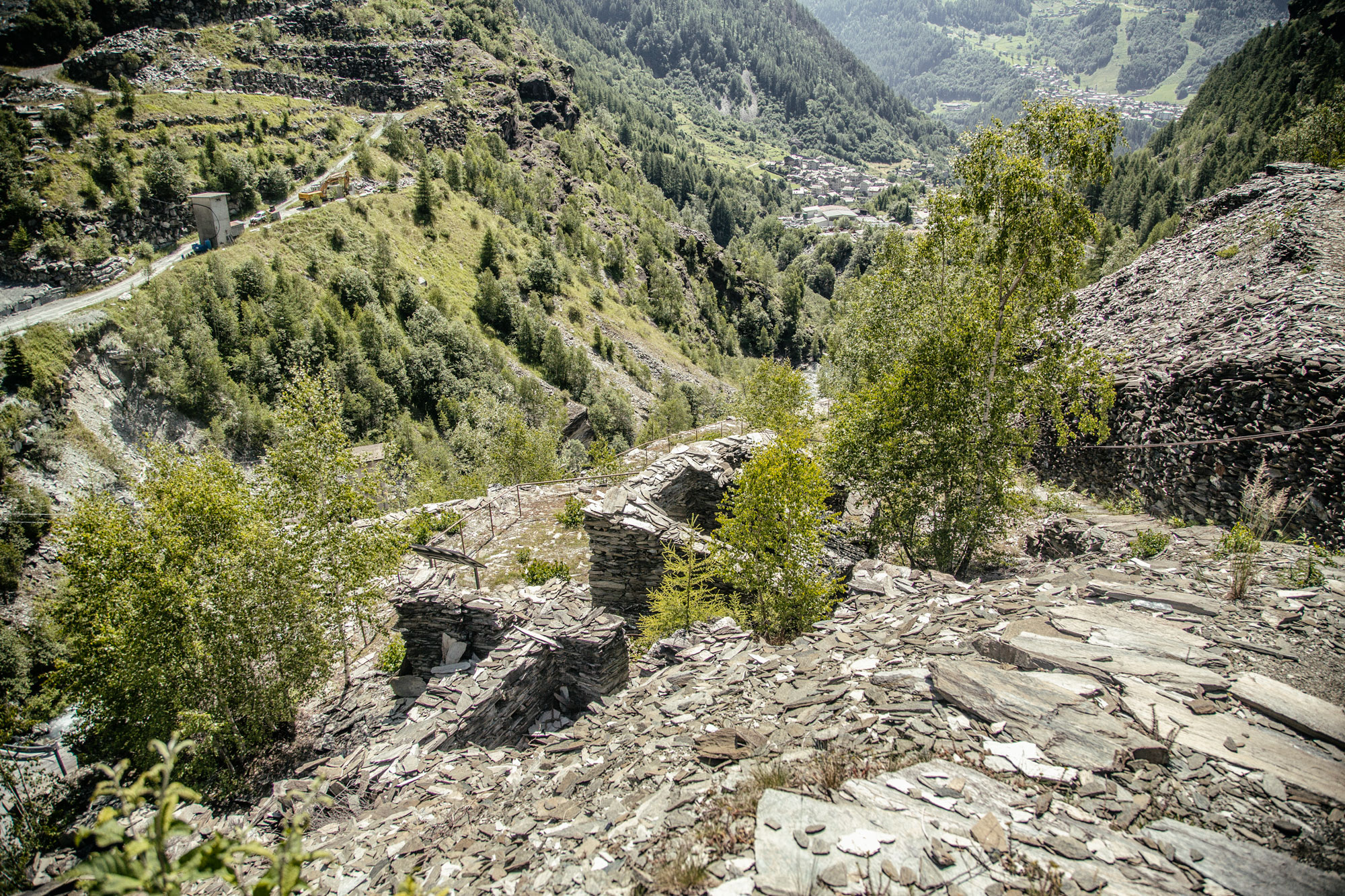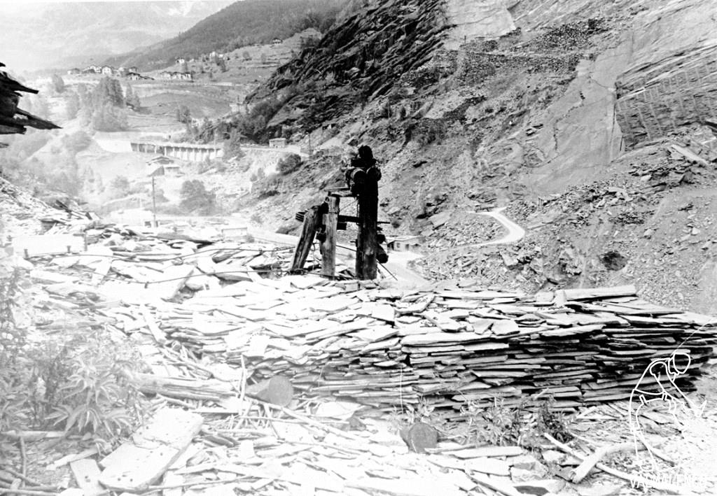 In origine, l’estrazione avveniva a cielo aperto, ma con l’esaurimento degli strati superficiali si passò alla realizzazione dei giuèi, cave sotterranee scavate lungo le “banche buone”, strati di Serpentino scistoso di qualità. Queste formazioni, inclinate verso il torrente Mallero, seguivano un doppio pendio da est a ovest e da sud a nord, creando una struttura complessa e faticosa da coltivare.